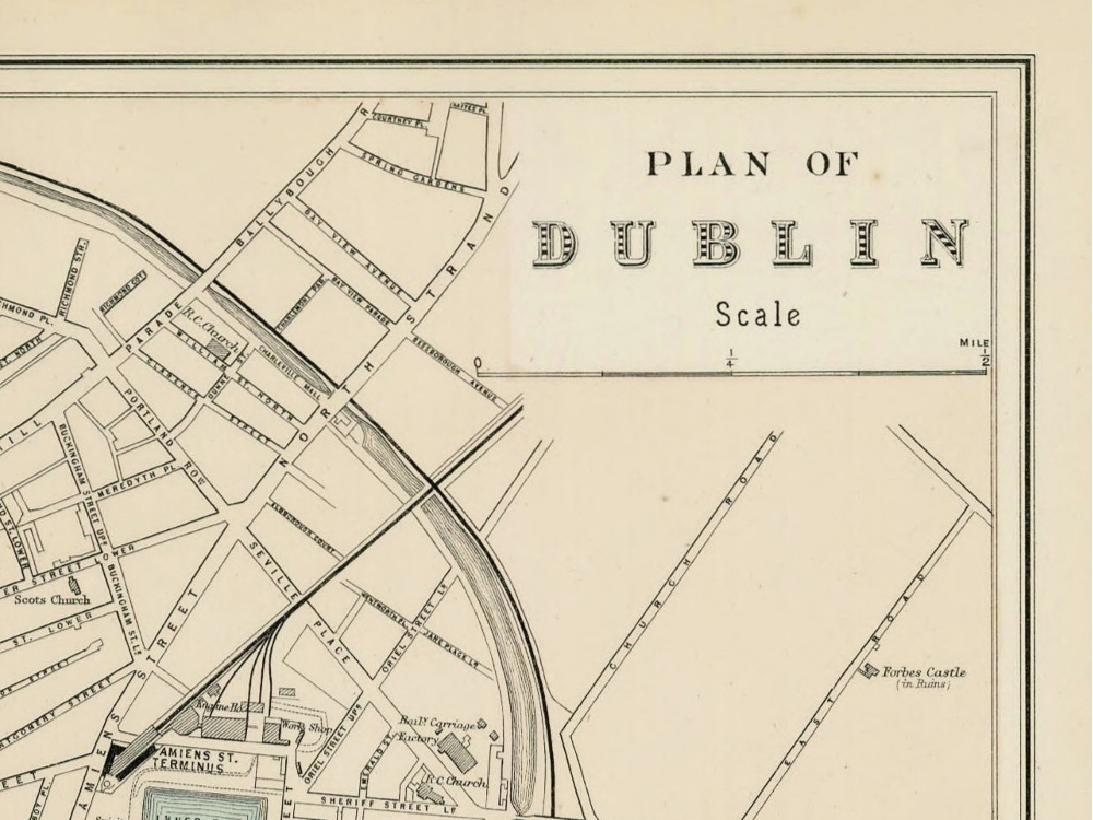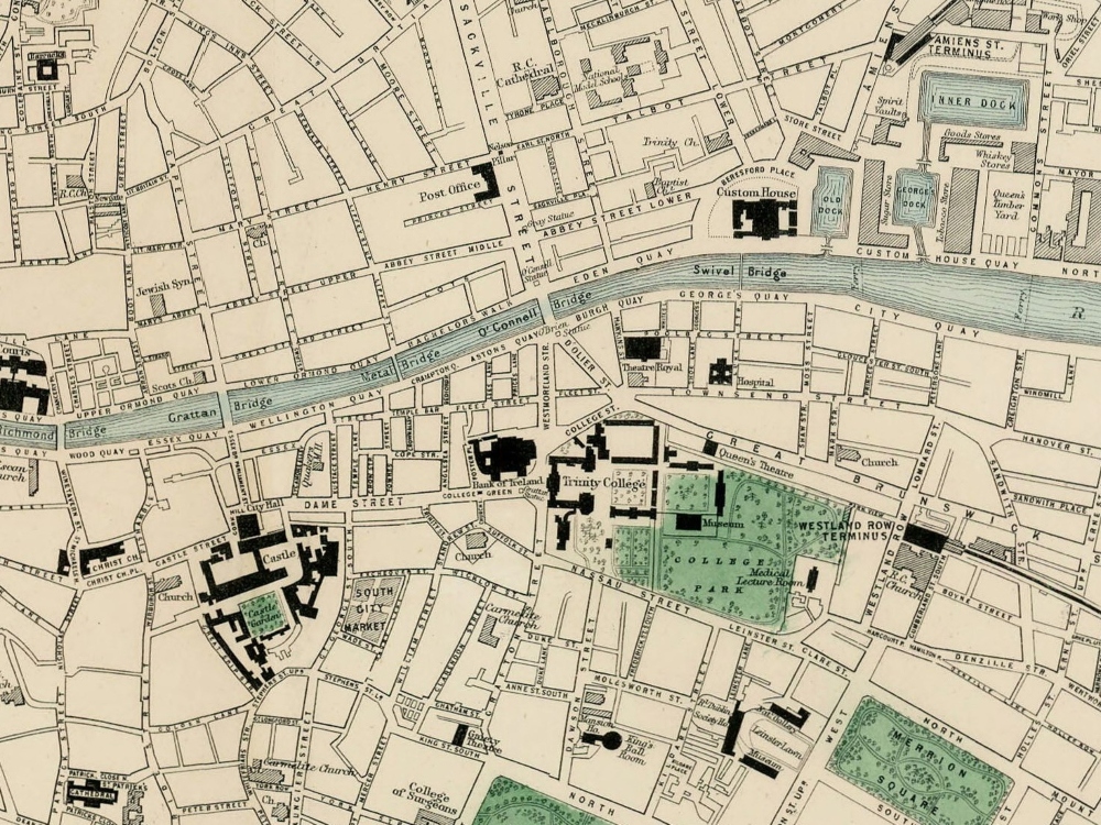 Vintage Map of Dublin from 1880 showing the streets, train stations, parks and major administrative buildings.