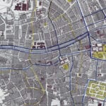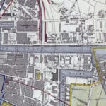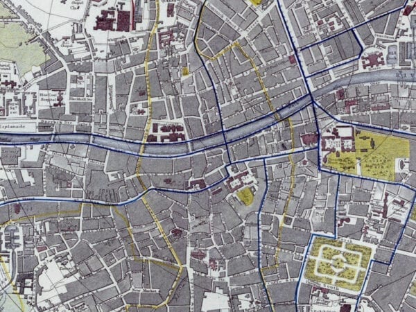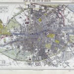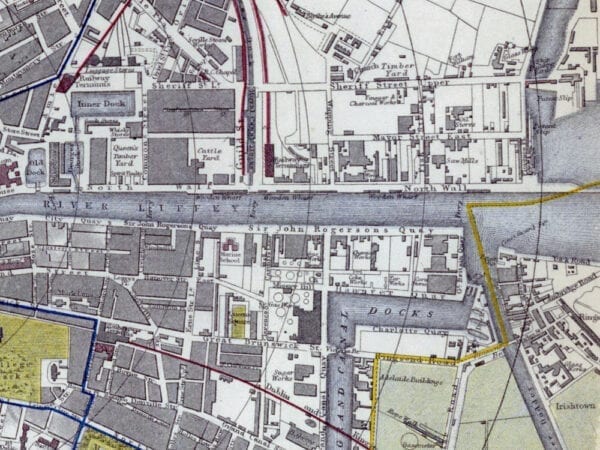 Letts & Son’s coloured map of Dublin from 1882. The Map depicts streets, buildings, parks, municipal and parliamentary boundaries and tram routes Also shown are two tables showing the value of imports and exports that flowed through the Custom House in the preceding years.