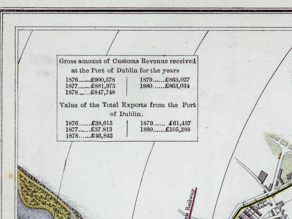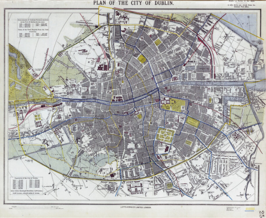 Letts & Son’s coloured map of Dublin from 1882. The Map depicts streets, buildings, parks, municipal and parliamentary boundaries and tram routes Also shown are two tables showing the value of imports and exports that flowed through the Custom House in the preceding years.