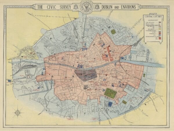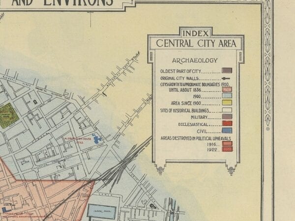 Civic Survey Map of Dublin, Ireland from 1925. The particular Map shows the suburbs, administrative divisions, as well as the details of the places of archaeological interest in the greater Dublin area.