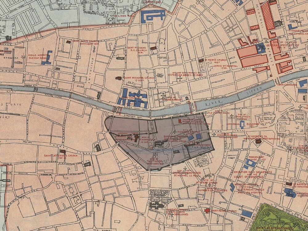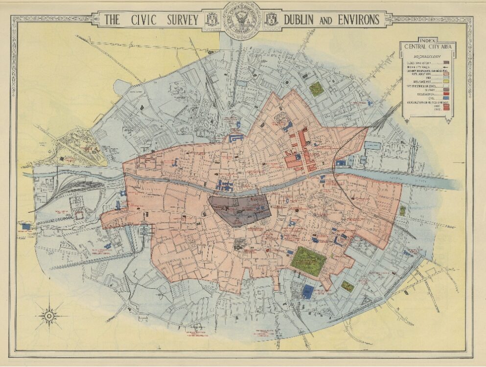 Civic Survey Map of Dublin, Ireland from 1925. The particular Map shows the suburbs, administrative divisions, as well as the details of the places of archaeological interest in the greater Dublin area.