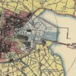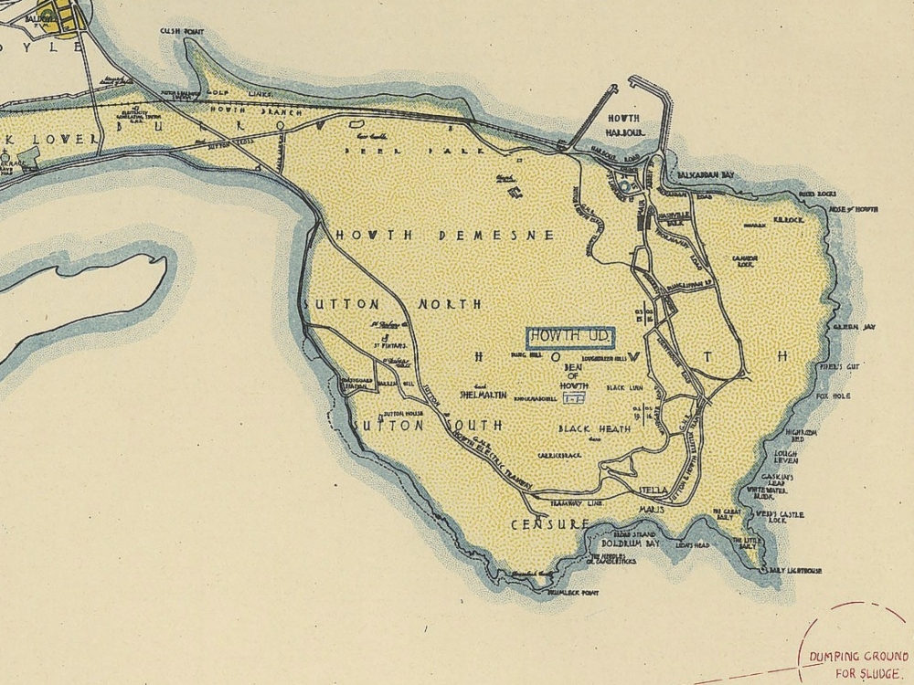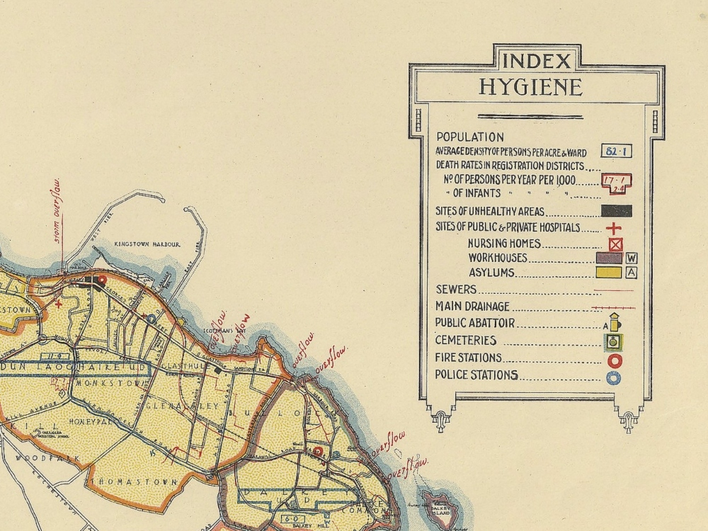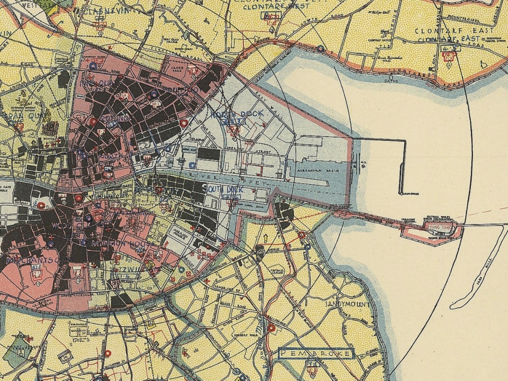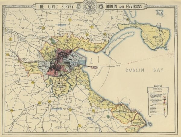 Civic Survey Map of Dublin, Ireland from 1925. The particular Map shows the suburbs, administrative divisions, as well as the details of the current and proposed sewerage sytem for the greater Dublin area.