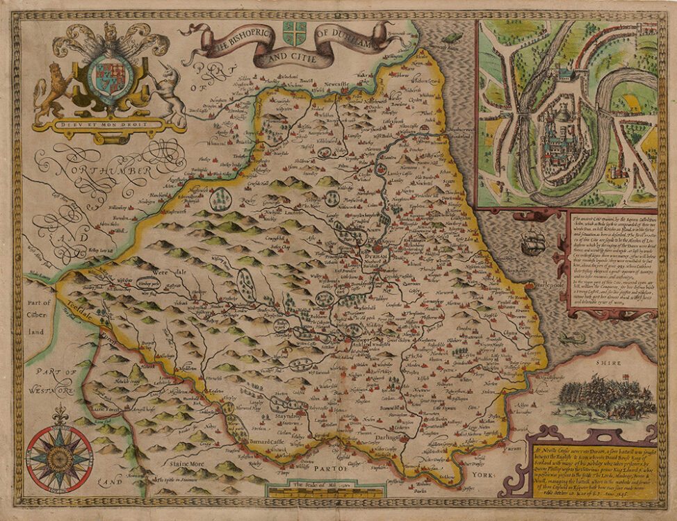 Vintage Map of Durham from John Speed’s Theatre of the Empire of Great Britaine 1676, to this day one of the most important Atlases ever produced.