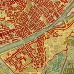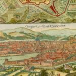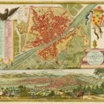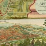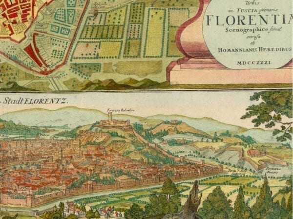 Homann’s Plan of Florence from 1731. The map includes a panoramic view of the city from the hillside beyond the Arno and a key locating over 100 places of interest.