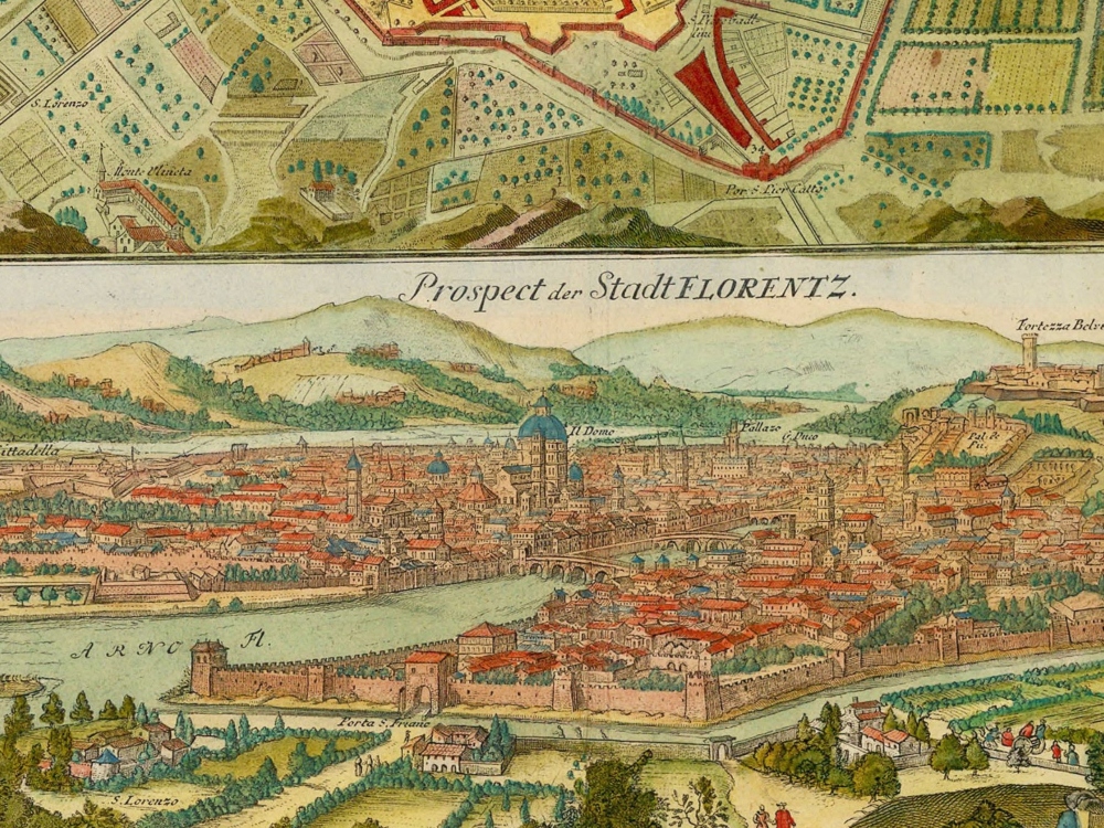 Homann’s Plan of Florence from 1731. The map includes a panoramic view of the city from the hillside beyond the Arno and a key locating over 100 places of interest.