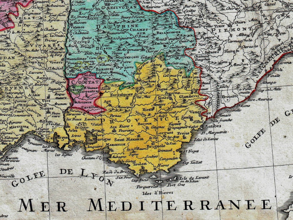 J.B. Homann’s 1741 map of France and parts of Italy, Switzerland, Spain and Germany. The map includes fortified cities, villages, roads, bridges, forests, and castles as they were in the mid-eighteenth century. Also shown are the English Channel and part of England itself as well as the Mediterranean Sea.