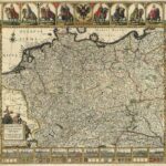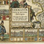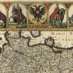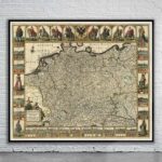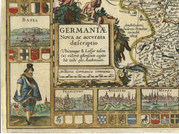 Cloppenburg’s Map of Germany from 1630, also encompassing Switzerland, Austria and Bohemia. The upper panel features equestrian portraits of the Holy Roman Emperor and the seven Electors; the side borders have costume vignettes of a noble couple, city dwellers and rustics, with prospects of (left) Prague, Speyer, Nuremberg and Basel, (right) Cologne, Vienna, Regensburg and Ulm. The bottom panel has prospects of Frankfurt, Augsburg, Mentz, Leipzig, Strassburg, Lubeck, Heidelburg, Brunswick, Trier and Hamburg.