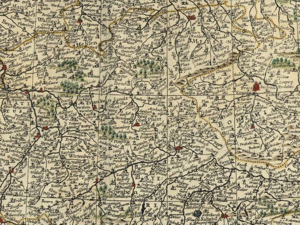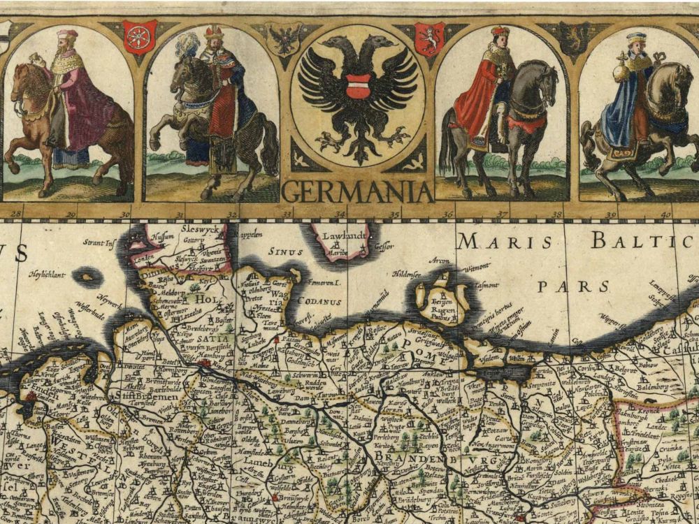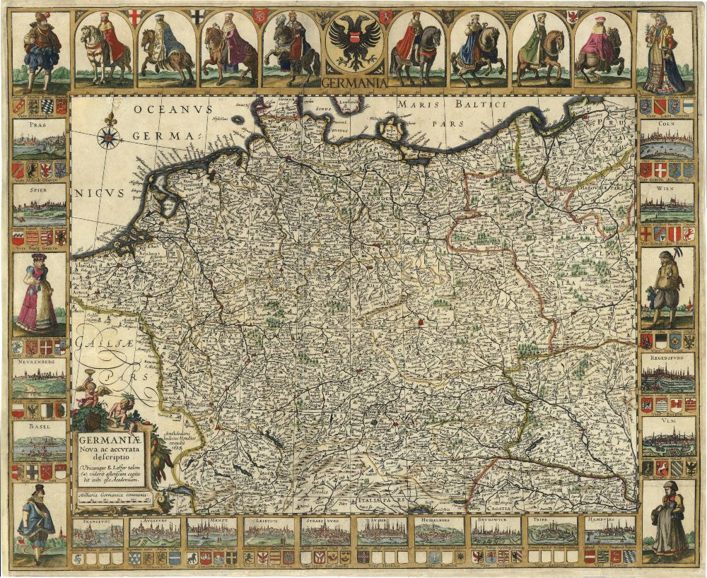 Cloppenburg’s Map of Germany from 1630, also encompassing Switzerland, Austria and Bohemia. The upper panel features equestrian portraits of the Holy Roman Emperor and the seven Electors; the side borders have costume vignettes of a noble couple, city dwellers and rustics, with prospects of (left) Prague, Speyer, Nuremberg and Basel, (right) Cologne, Vienna, Regensburg and Ulm. The bottom panel has prospects of Frankfurt, Augsburg, Mentz, Leipzig, Strassburg, Lubeck, Heidelburg, Brunswick, Trier and Hamburg.