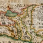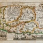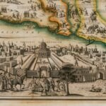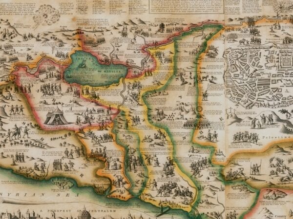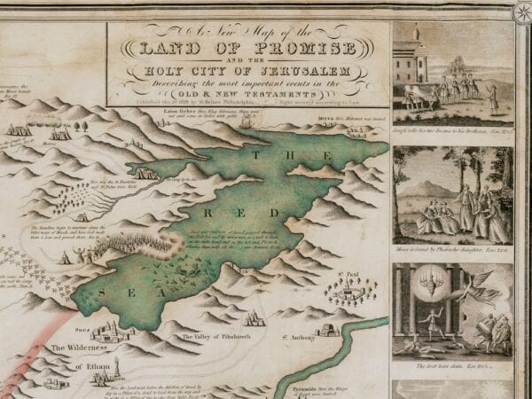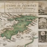 Haines’ Map of the Holy City of Jerusalem from 1828. The map depicts Old and New Testament stories, with pictorial vignettes together with references from the Bible. There is an inset view of the Temple of Solomon, a large inset plan of Jerusalem and an even larger bird’s-eye view of the city, as well as 14 larger vignettes depicting key moments of the Old Testament.