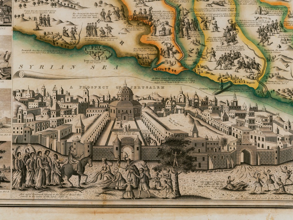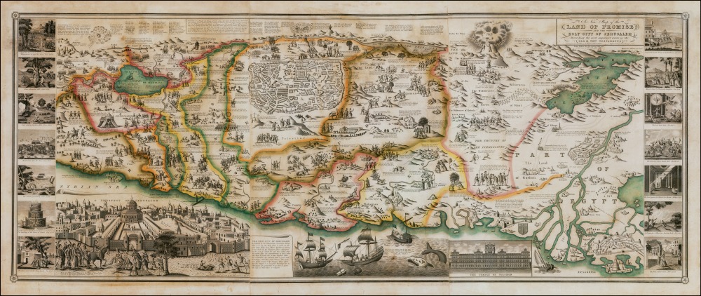 Haines’ Map of the Holy City of Jerusalem from 1828. The map depicts Old and New Testament stories, with pictorial vignettes together with references from the Bible. There is an inset view of the Temple of Solomon, a large inset plan of Jerusalem and an even larger bird’s-eye view of the city, as well as 14 larger vignettes depicting key moments of the Old Testament.