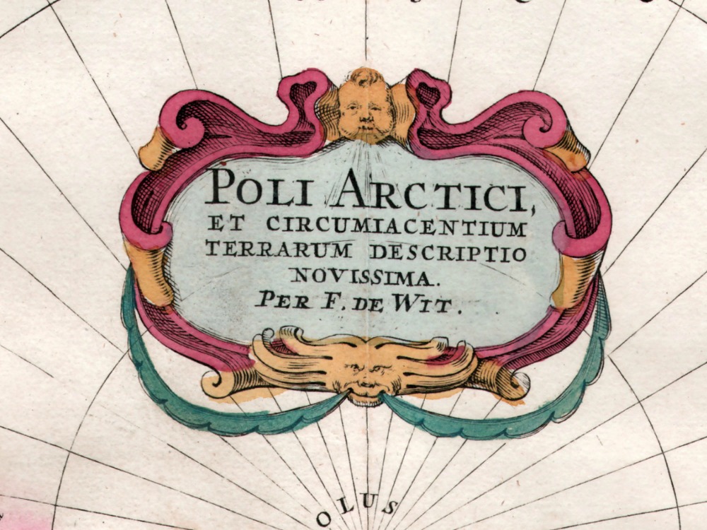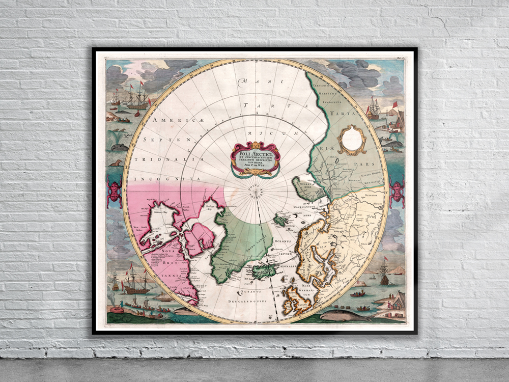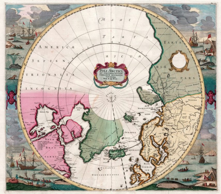 This beautiful map was made by Frederick De Wit in 1636. The map is circular, reaching South to 50°N. around it are beautifully carved scenes mostly dedicated to activities of Europeans in the Far North, most noticeably whaling. The West part of America is left blank, for lack of information.