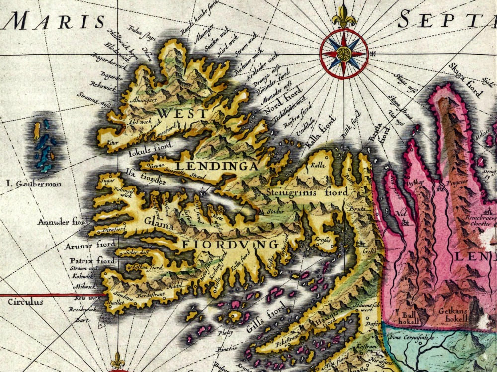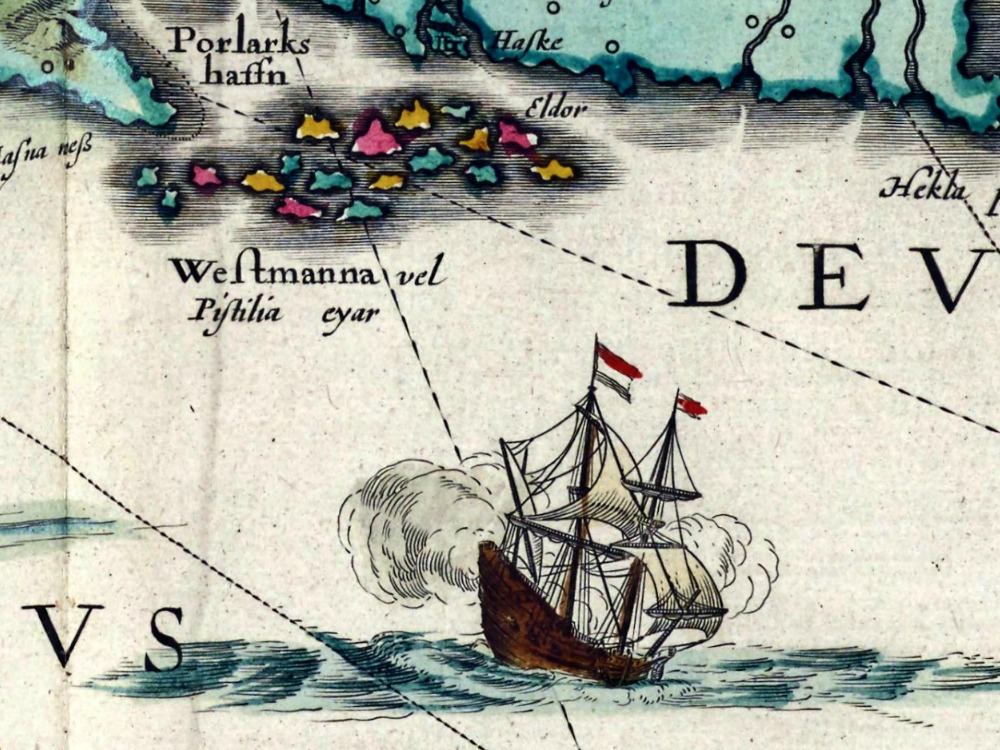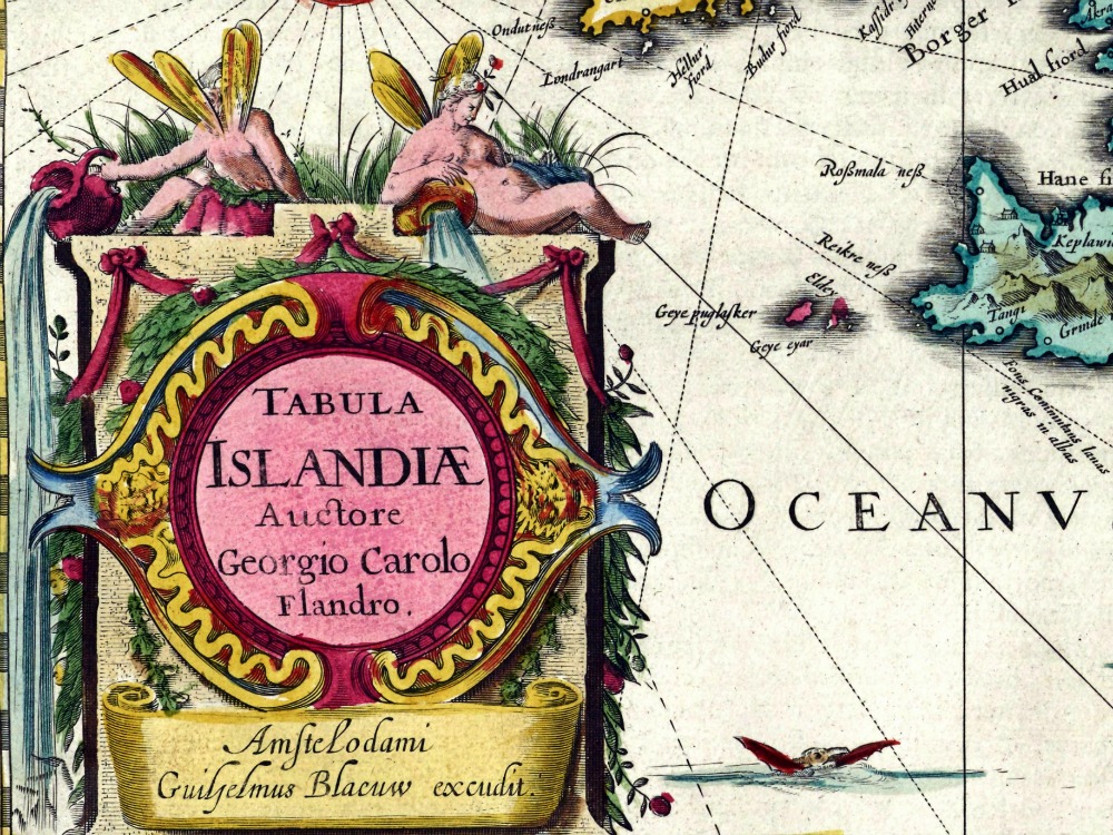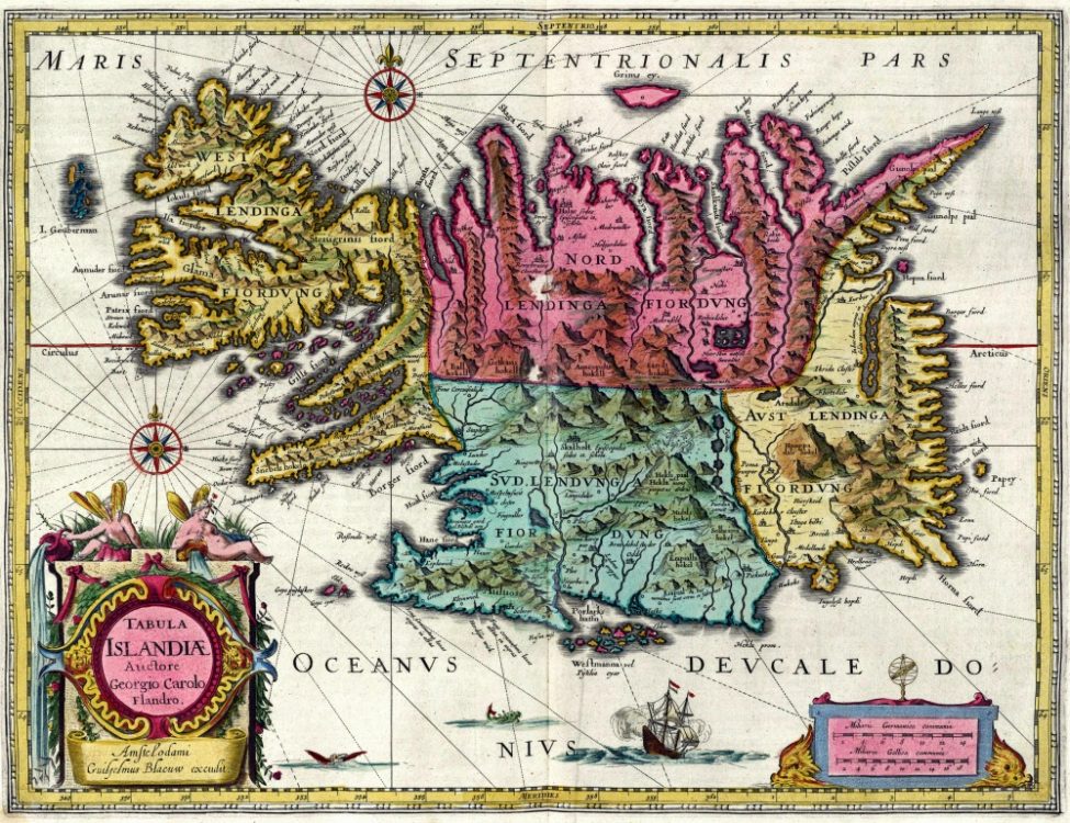 Blaeu’s stunning map of Iceland from 1665. The map contains Sea Monsters, Sailing Ships and even an erupting volcano! One of the most decorative antique maps available.