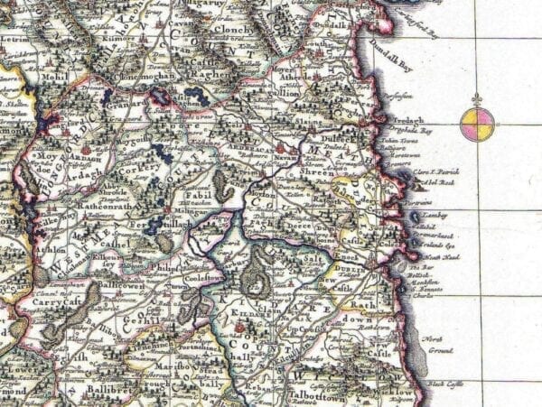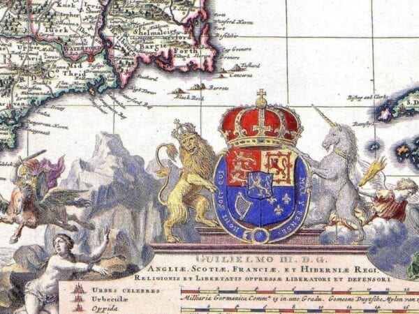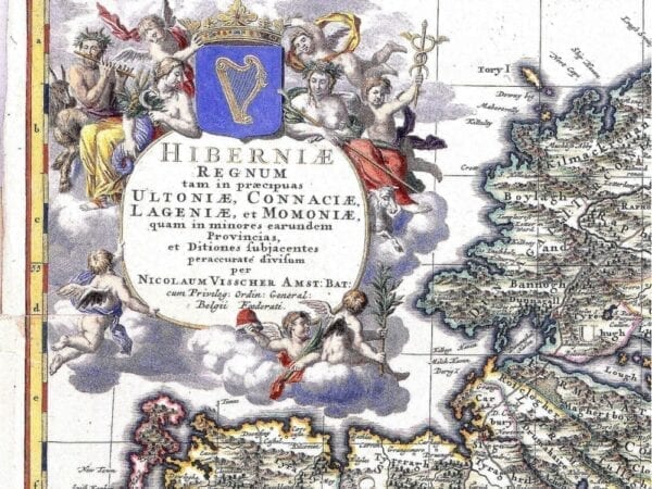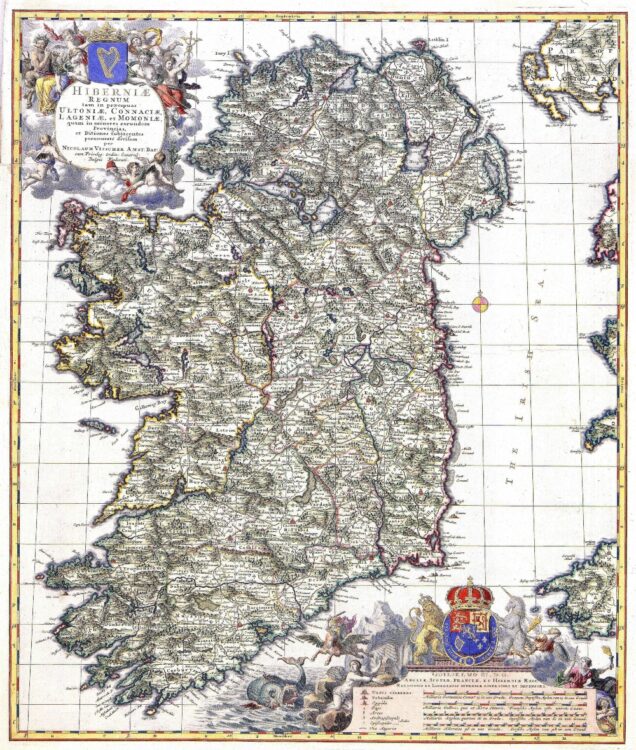 This map of Ireland was published by Nicolaes Visscher II (1649-1702) in 1689. The map is dedicated to King William III and his wife Mary Stuart who were crowned as king and queen of England, Scotland and Ireland in 1689.