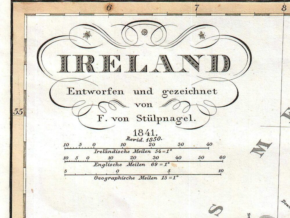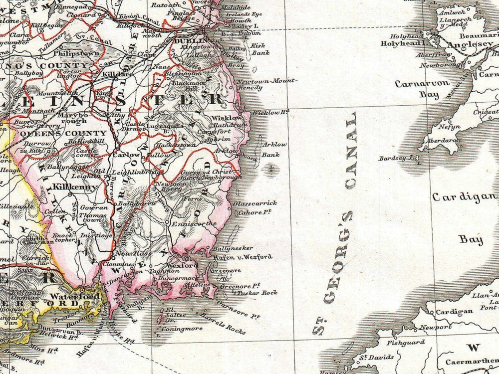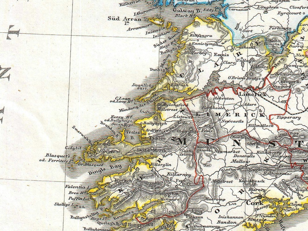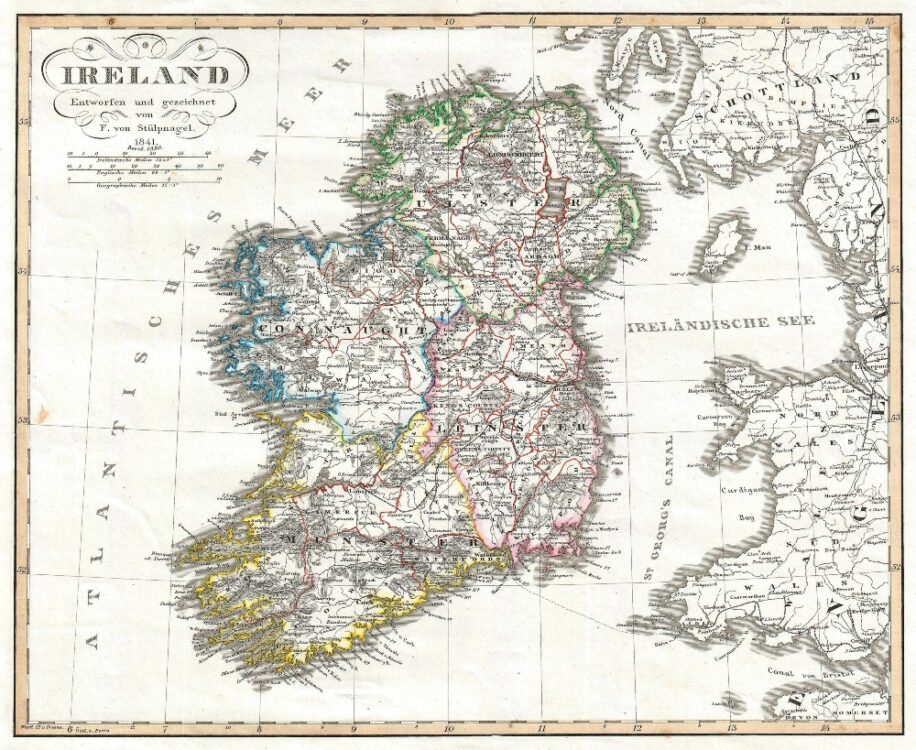 Justus Perthes Map of Ireland shows the island divided into its four provinces: Ulster, Connaught, Leinster and Munster. Shows roads, railroads, local political divisions and some of the surrounding waters and territories in England and Scotland.