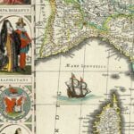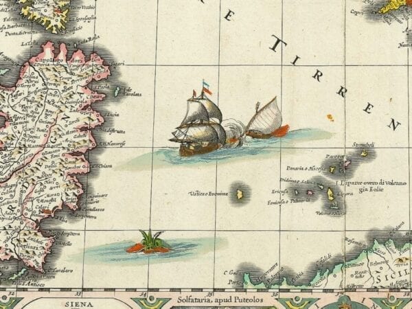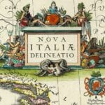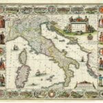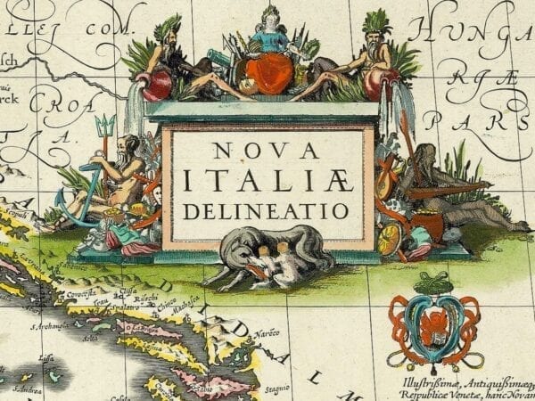 Hondius’ Map of Italy from 1620. The borders contain twelve prospects, including Rome, Naples, Venice, Florence, Genoa, Verona, Parma, Siena, Pozzuolo, Velletri, eight costume vignettes and six armorials.