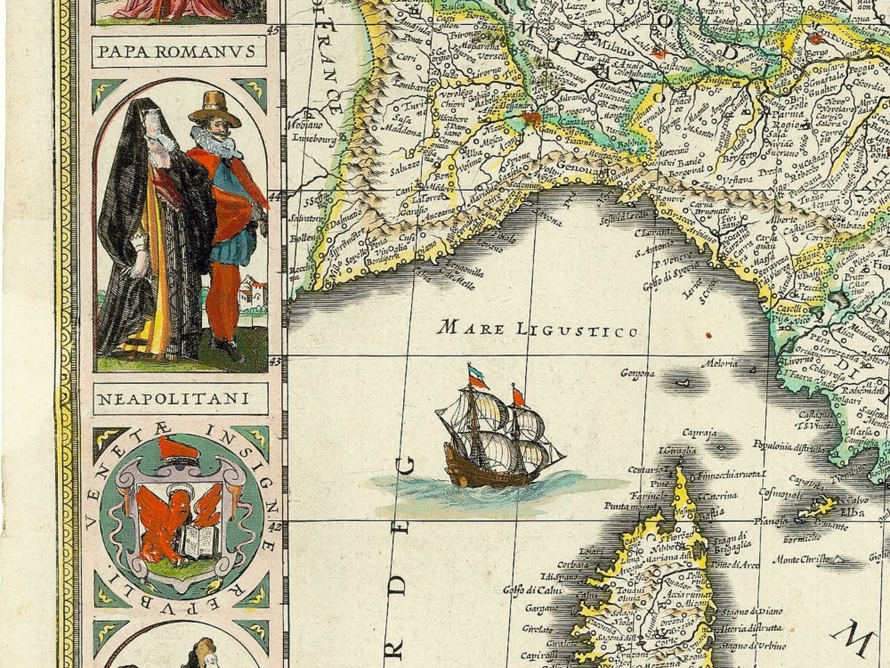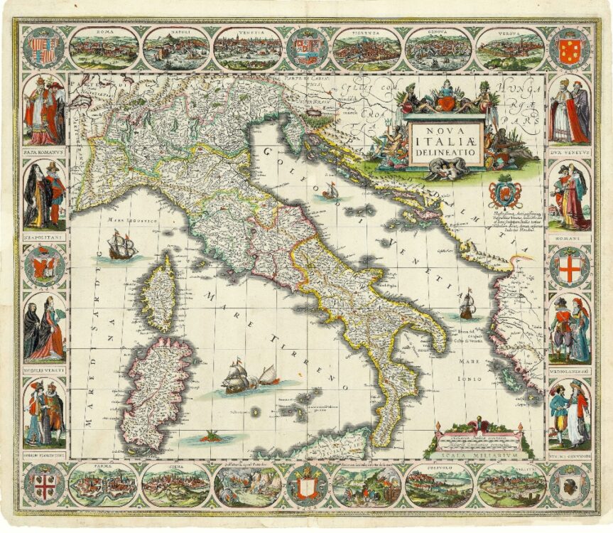 Hondius’ Map of Italy from 1620. The borders contain twelve prospects, including Rome, Naples, Venice, Florence, Genoa, Verona, Parma, Siena, Pozzuolo, Velletri, eight costume vignettes and six armorials.