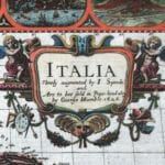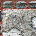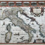 John Speed’s Map of Italy from 1626. The whole of Italy is depicted, along with Corsica, Sardinia, the Aeolian Islands and part of Sicily. The Dalmatian Islands are also included, along with their Italian names. On the side borders are illustrations of the Pope,the Duke of Venice, the people of Venice, Florence, Genoa, Milan and Rome, and the arms of the Pope, Venice, Sardinia and Corsica. Along the top of the map are aspects of Italy’s major cities, Venice, Rome, Florence, Verona and Naples.