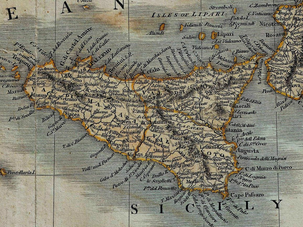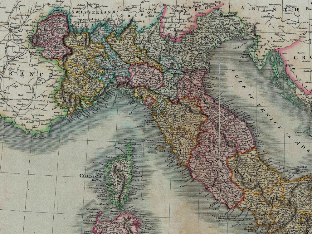 John Cary’s 1799 map of Italy, Sicily, Sardinia and Corsica, colored by Kingdoms, and including postal roads and many other fine details.
