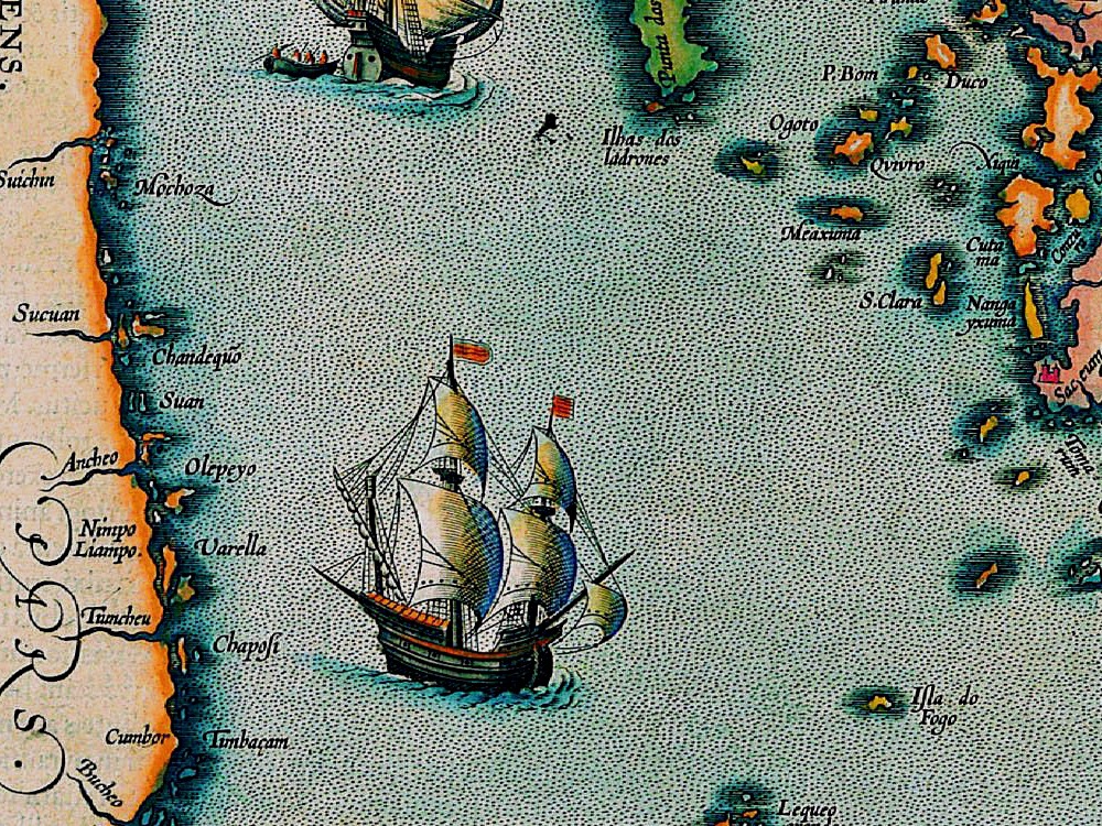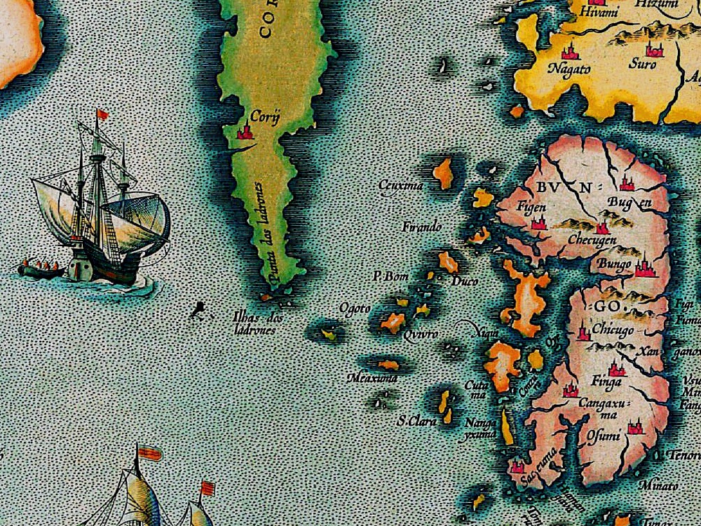 Ortelius’s Map of Japan from 1595. The first printed map of Japan to appear in an atlas, appearing in his Theatrum Orbis Terrarum. Korea is shown as an elongated island whilst Japan is shown with just the three principal islands of the archipelago.