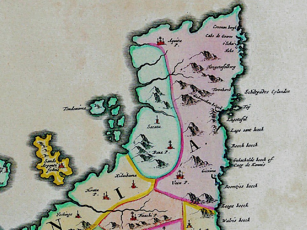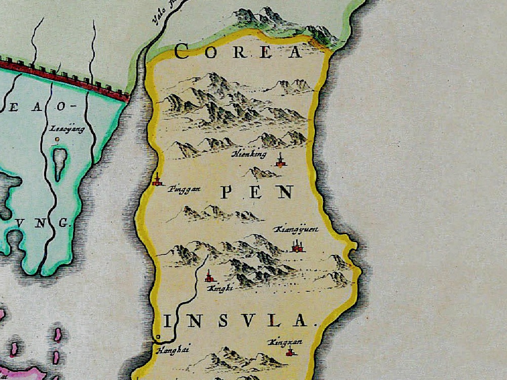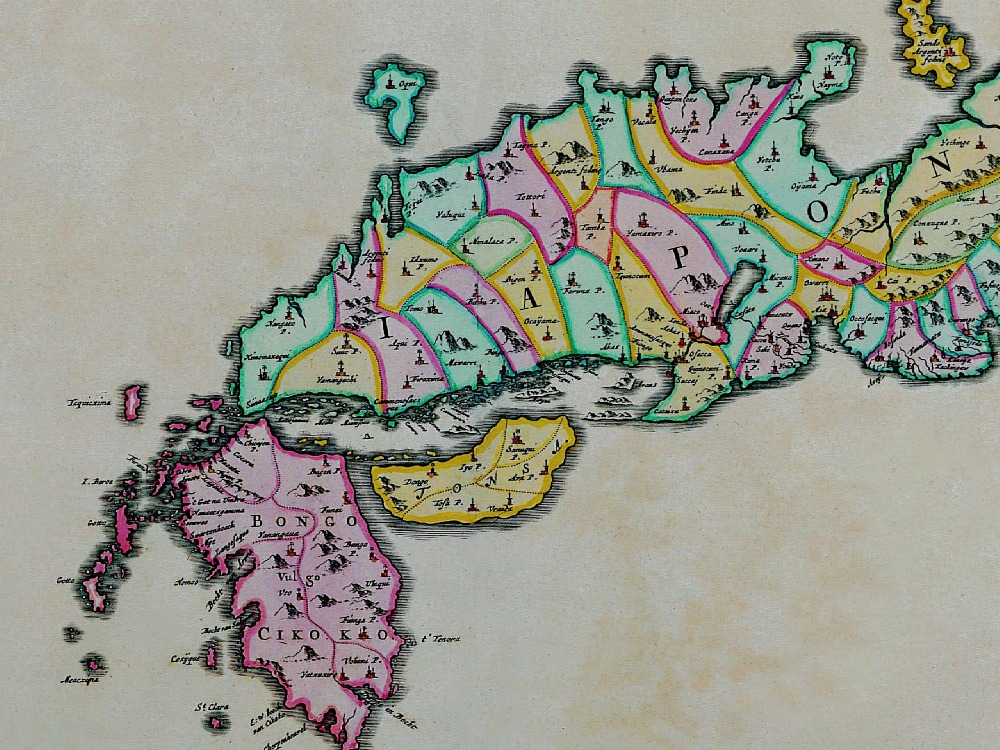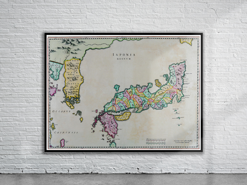 Blaeu’s 1665 map of Japan entitled “Japonia Regnum”. The map depicts neigbouring Korea as well as the coast of China.