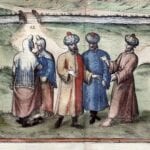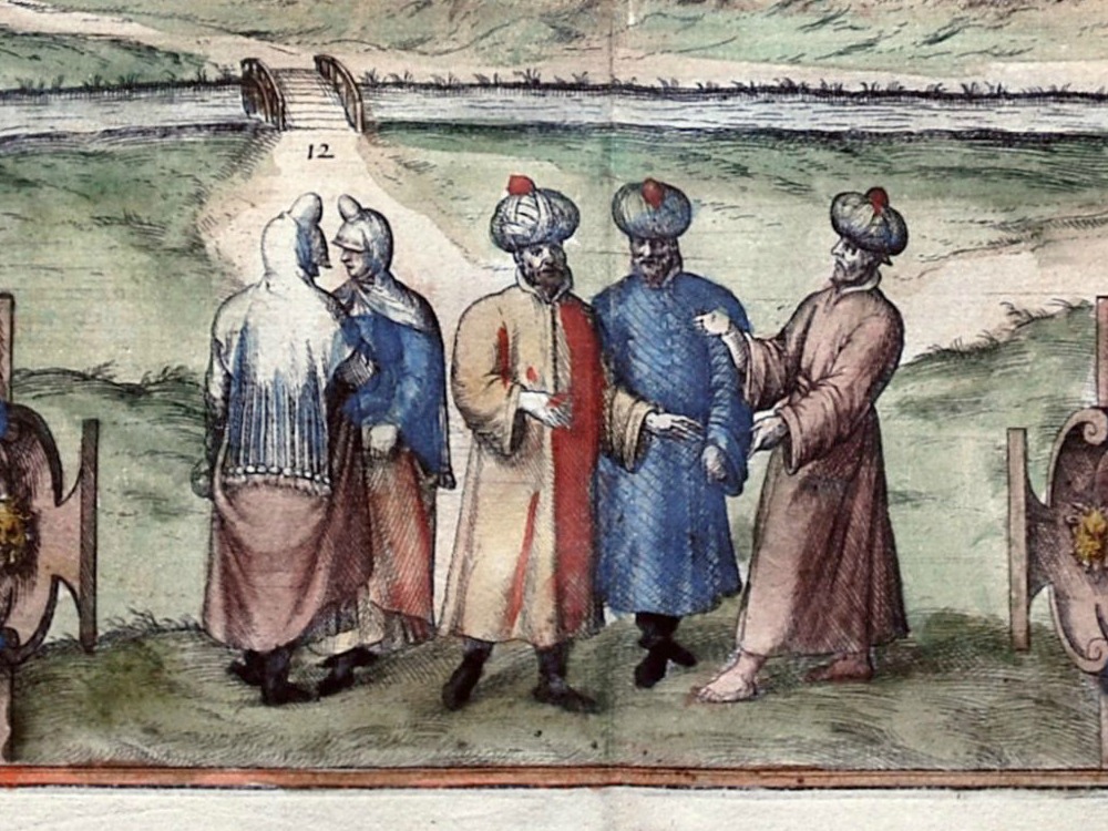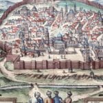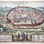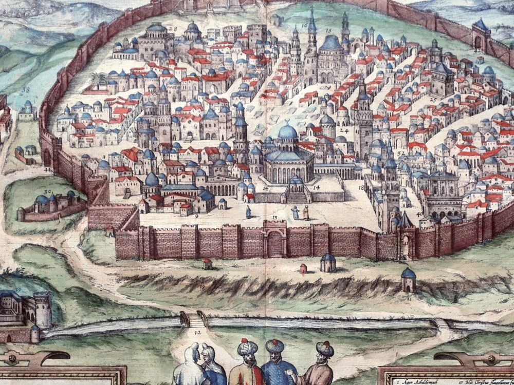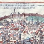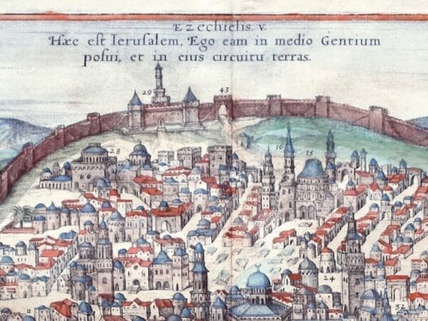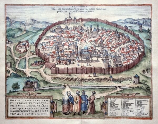 Braun & Hogenberg’s Map of Jerusalem from the Civitates Orbis Terrarum in 1572. The key lists many sites from early Christianity including the birthplace of Mary, the Hill of Calvary and the Church of the Holy Sepulchre.