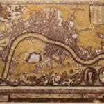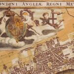 Frederick De Wit’s Plan and View of London from 1695. The Map includes an inset panoramic view of London at the bottom with the portraits of William III and Mary.