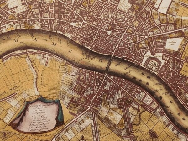With ‘Names of Places Containd in this Mapp’ (key to numbers 1-148) and in the centre of the map ‘Places of Southwark’ (key 1-10).