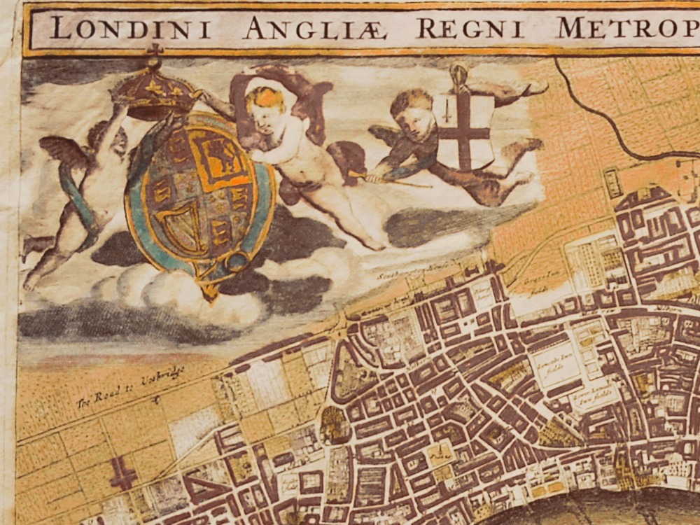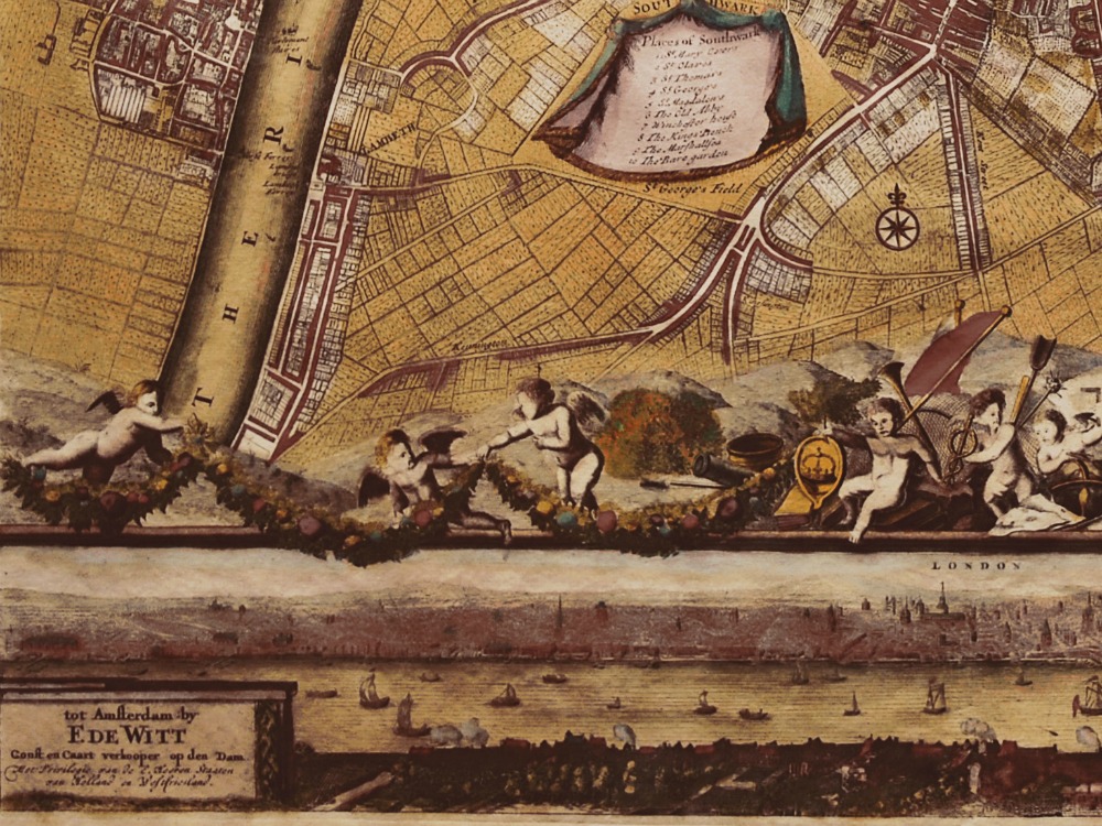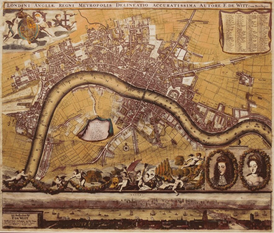 Frederick De Wit’s Plan and View of London from 1695. The Map includes an inset panoramic view of London at the bottom with the portraits of William III and Mary.