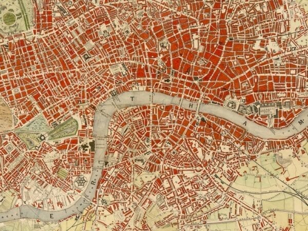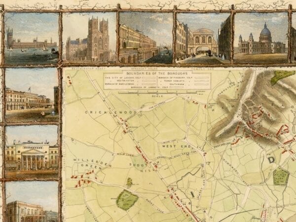 Tallis’s highly decorative Map of London from 1851 includes 50 separate city views around the perimeter of the map.