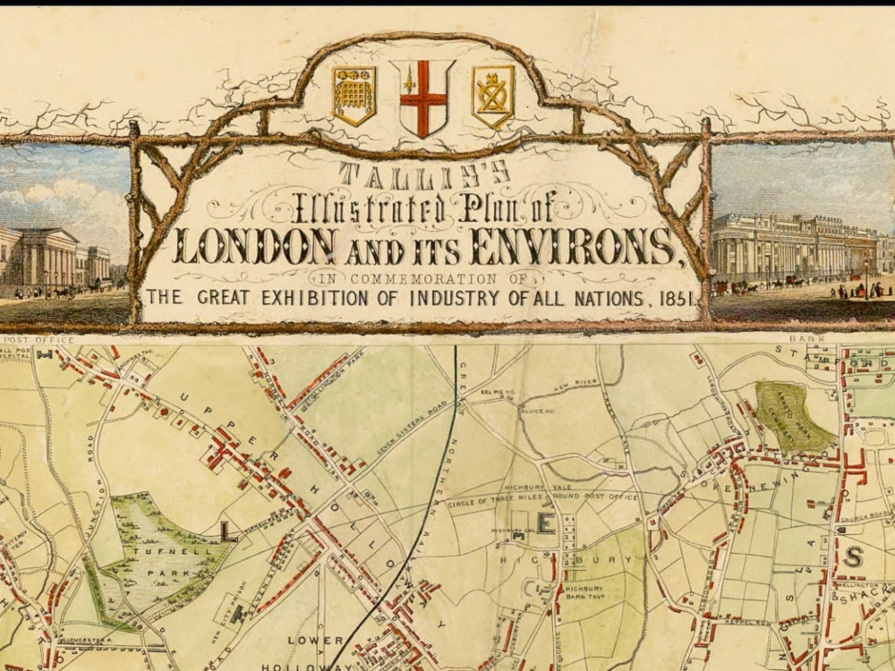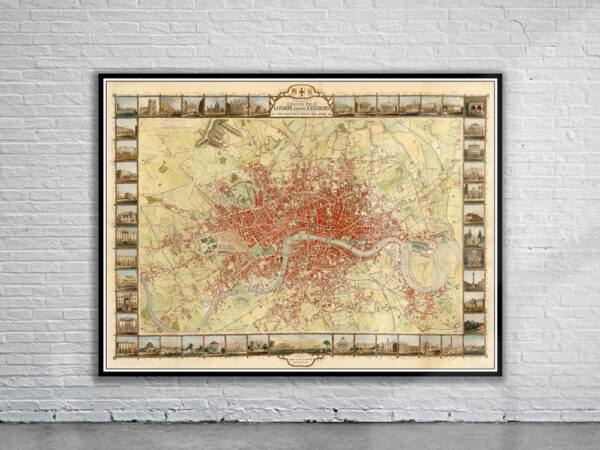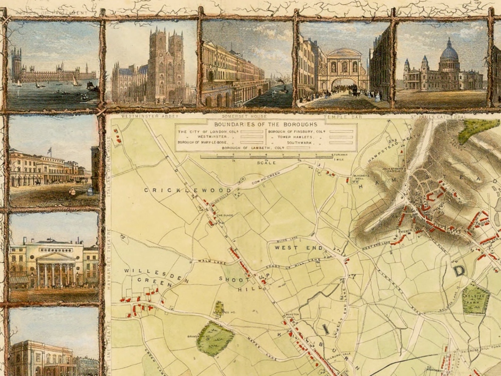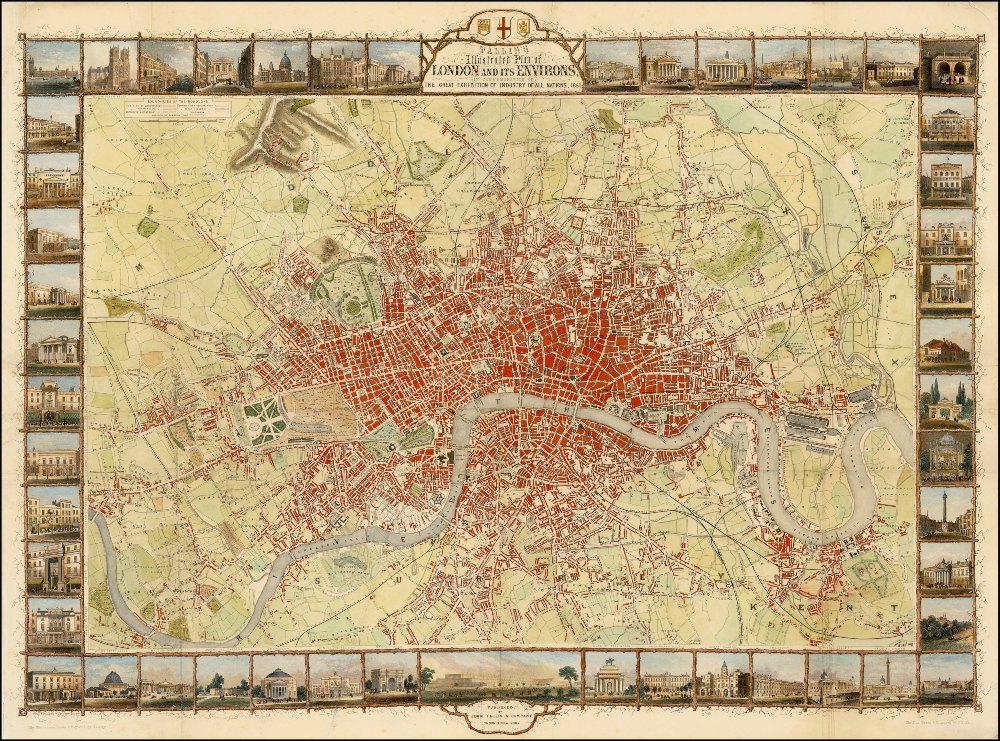 Tallis’s highly decorative Map of London from 1851 includes 50 separate city views around the perimeter of the map.
