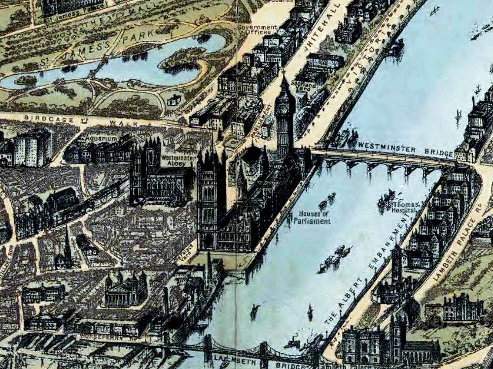 Chas Baker & Co.’s 1897 Map of London, showing Buckingham Palace, the Houses of Parliament and St. Paul’s Cathedral.