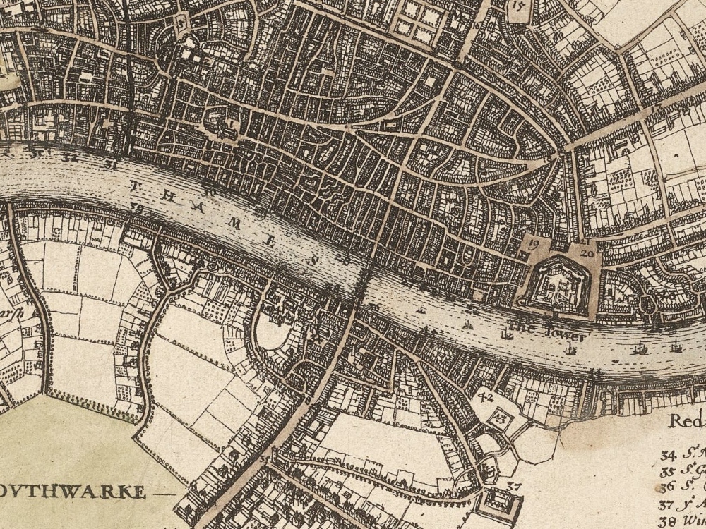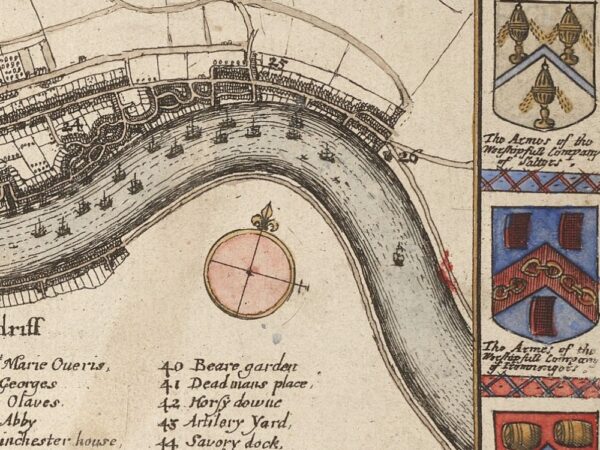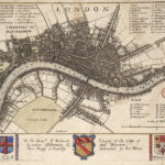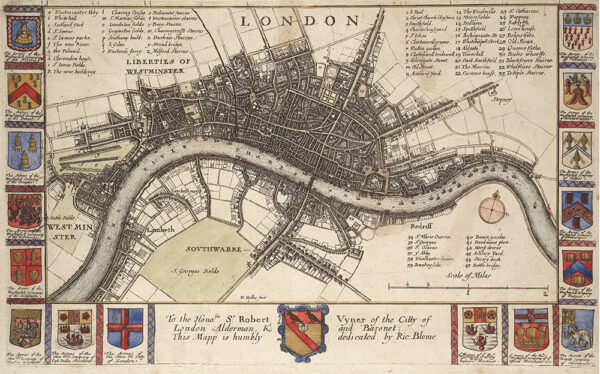 W. Hollar’s Plan of London before the Great Fire in 1666. The map has an extensive key and ten crests of City Companies including the ‘East India Merchants’, ‘Turkey Merchants’ and ‘Royall Company of Adventurers’