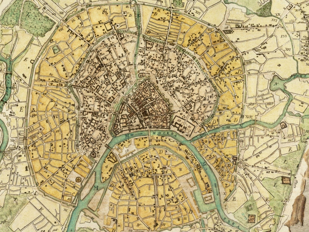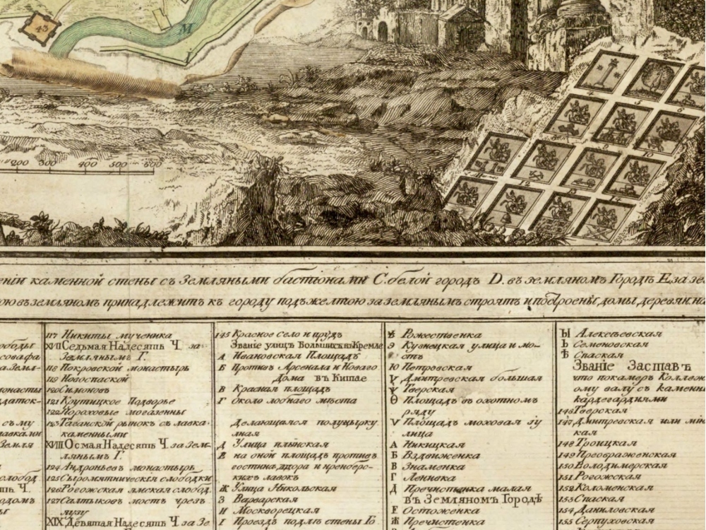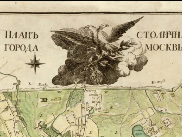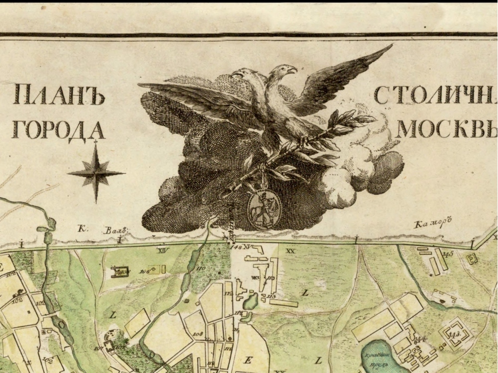 An extremely unusual Map of Moscow from 1789. At the top of the map is an image of the Russian Imperial Double-Headed Eagle. A key of Moscows 14 wards as well as another large key showing key sites and buildings.