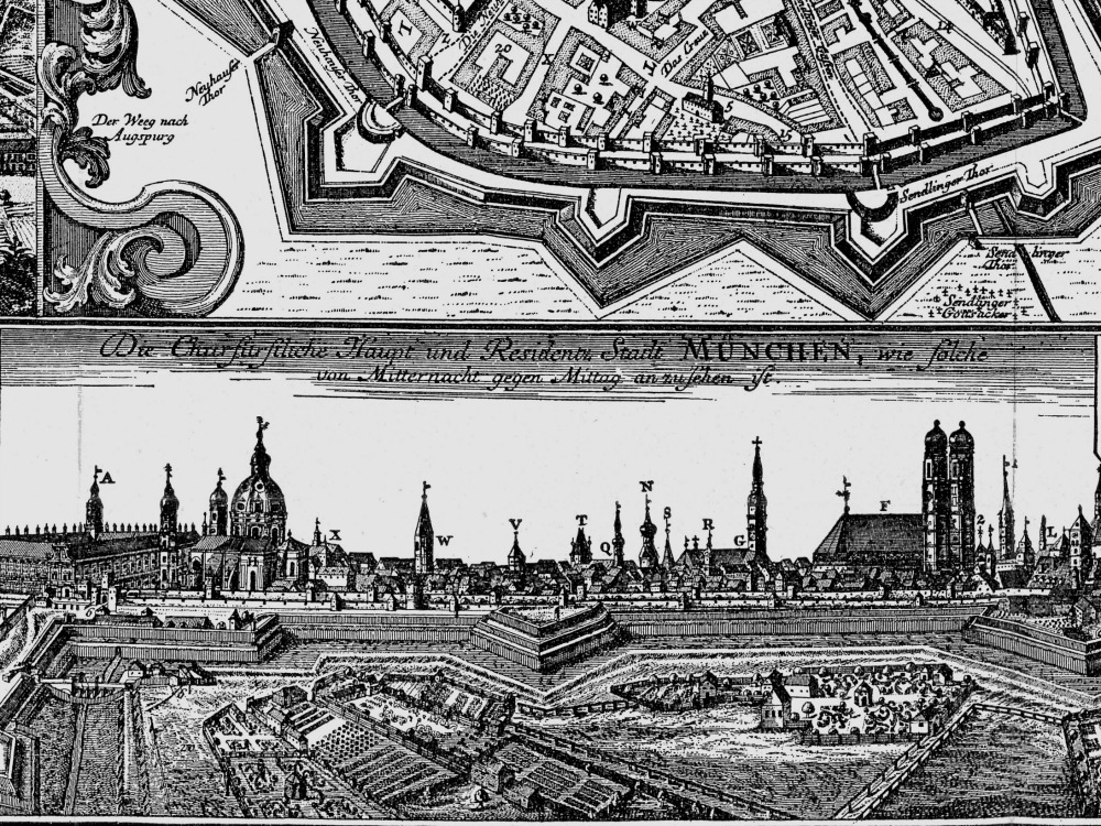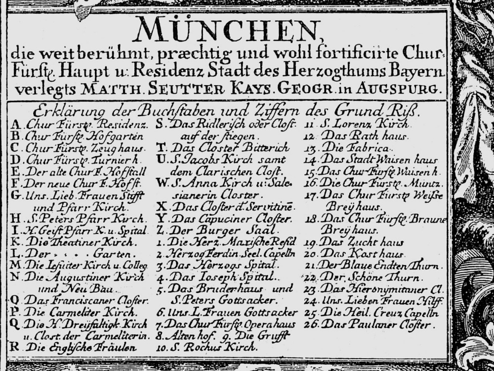 Large plan of the city of Munich by Matthäus Seutter from 1740. Shows city fortification and individual buildings, as well as a detailed key. To the left is a small inset view of Nymphenburg Castle and in the lower third a panorama of the city.