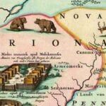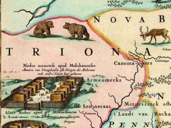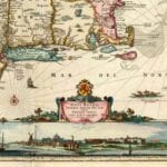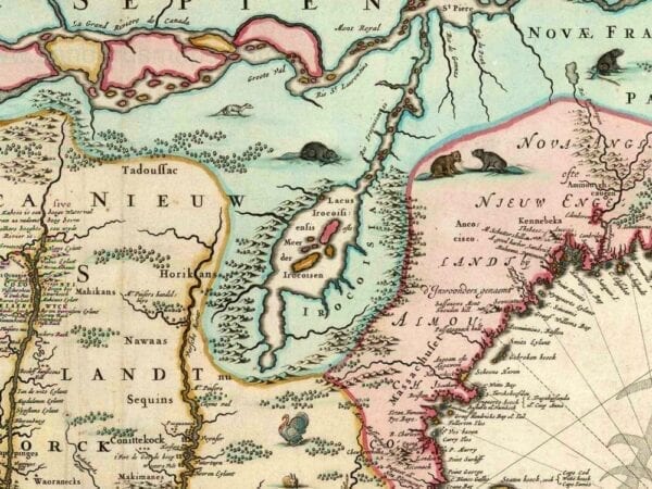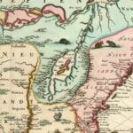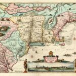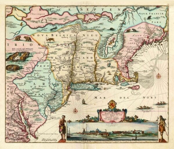 Justus Danckert’s map of New England and the surrounding areas from 1673, including an inset view of the Dutch colony on Manhattan Island. A magnificent full colour and very detailed map.