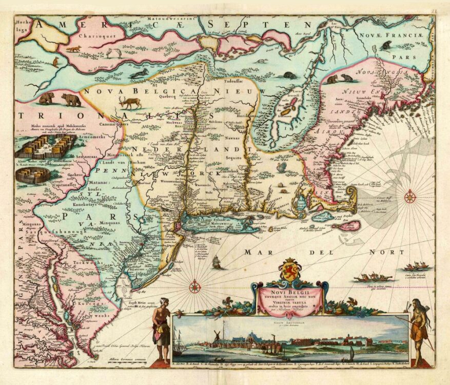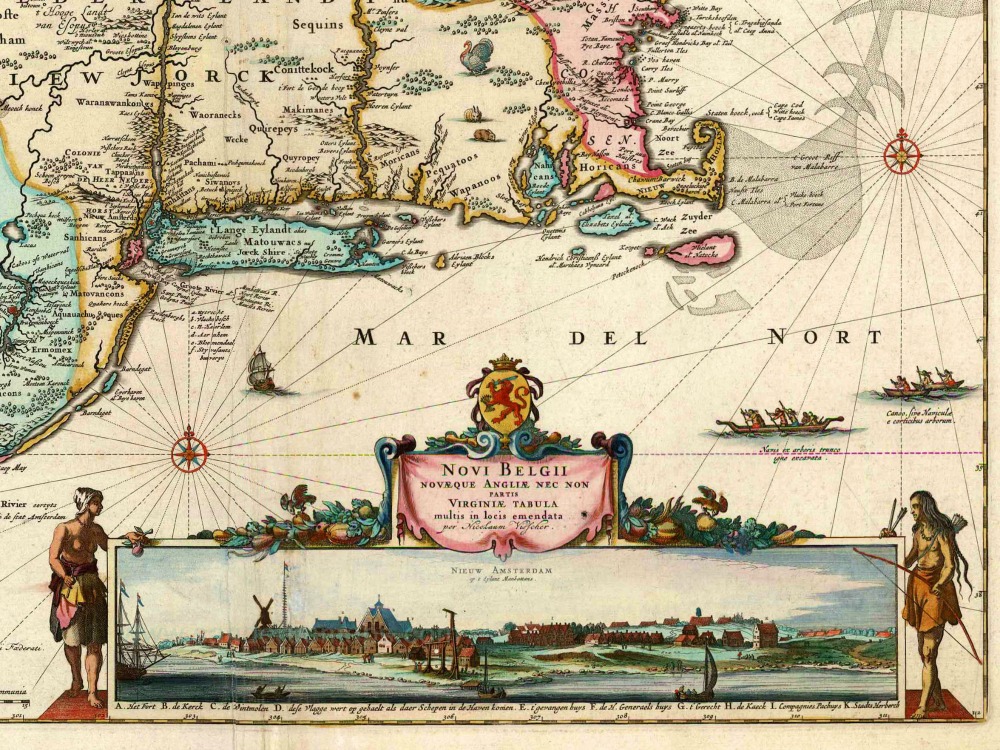 Justus Danckert’s map of New England and the surrounding areas from 1673, including an inset view of the Dutch colony on Manhattan Island. A magnificent full colour and very detailed map.