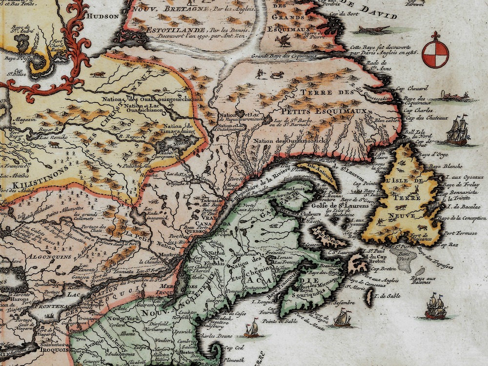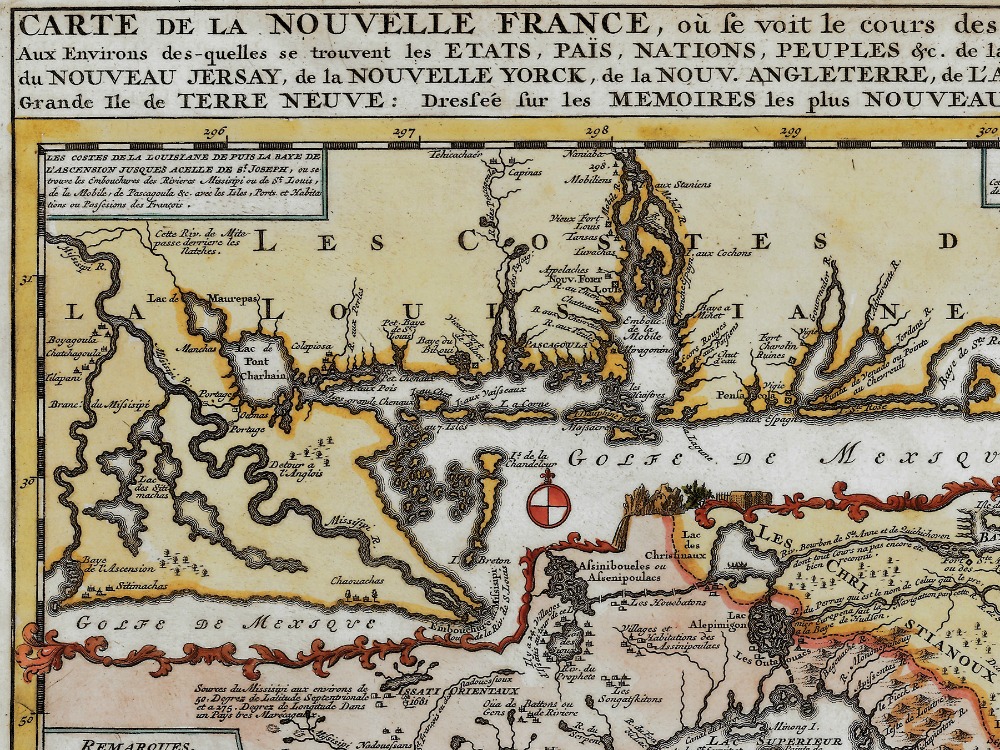 Chatelain’s 1719 map of North America with an insert of the Mississippi River Delta and the Gulf Coast. The map is filled with wildlife, scenes of Indians hunting; Indian villages and notations, and the oceans are embellished with numerous ships, canoes and sea monsters.