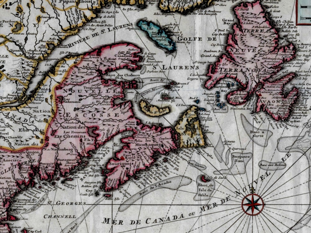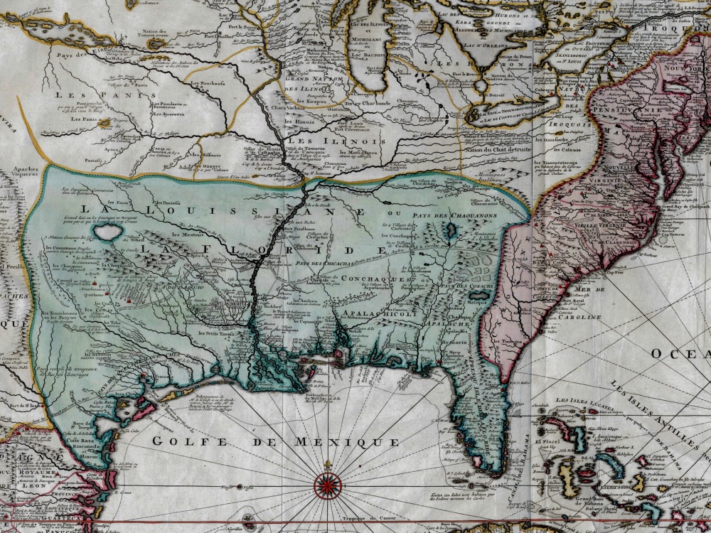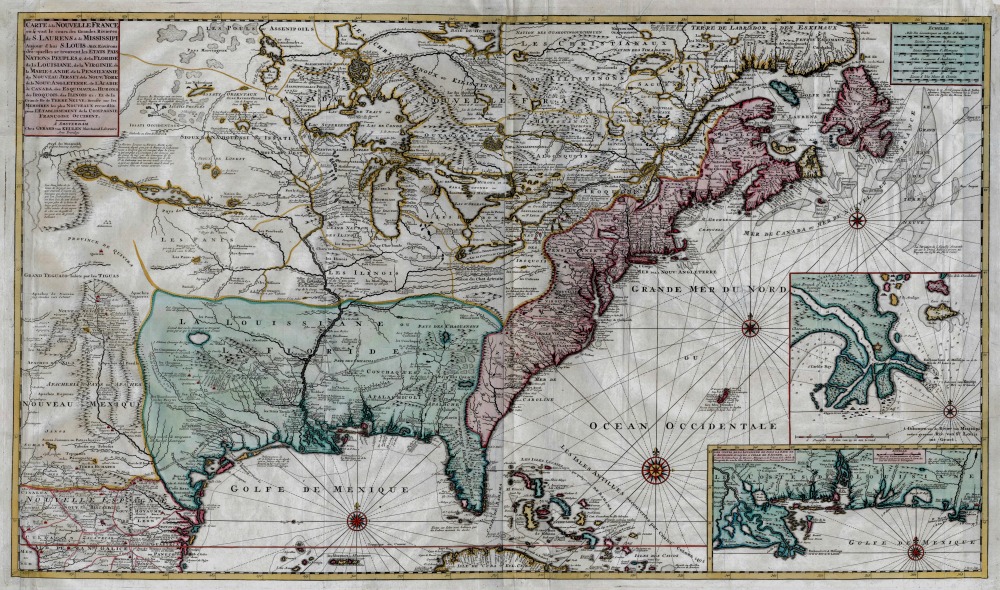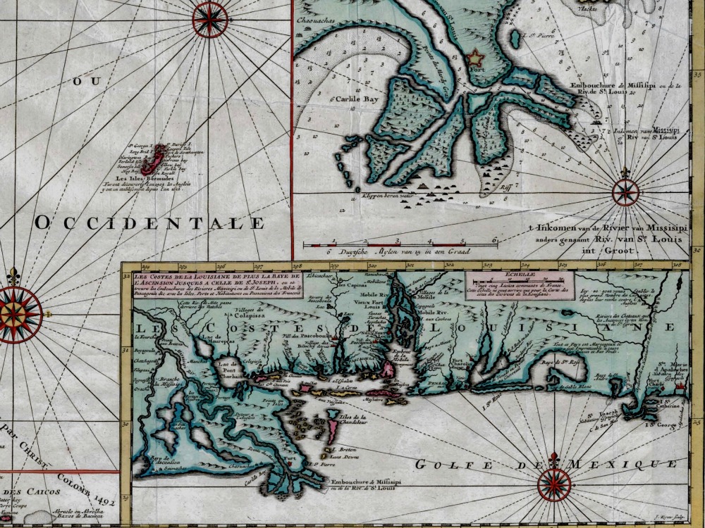 Van Keulen’s 1720 Map of New France which shows French Louisiana and Texas. The insets on the bottom right depict a portion of the Gulf Coast and the mouth of the Mississippi River.