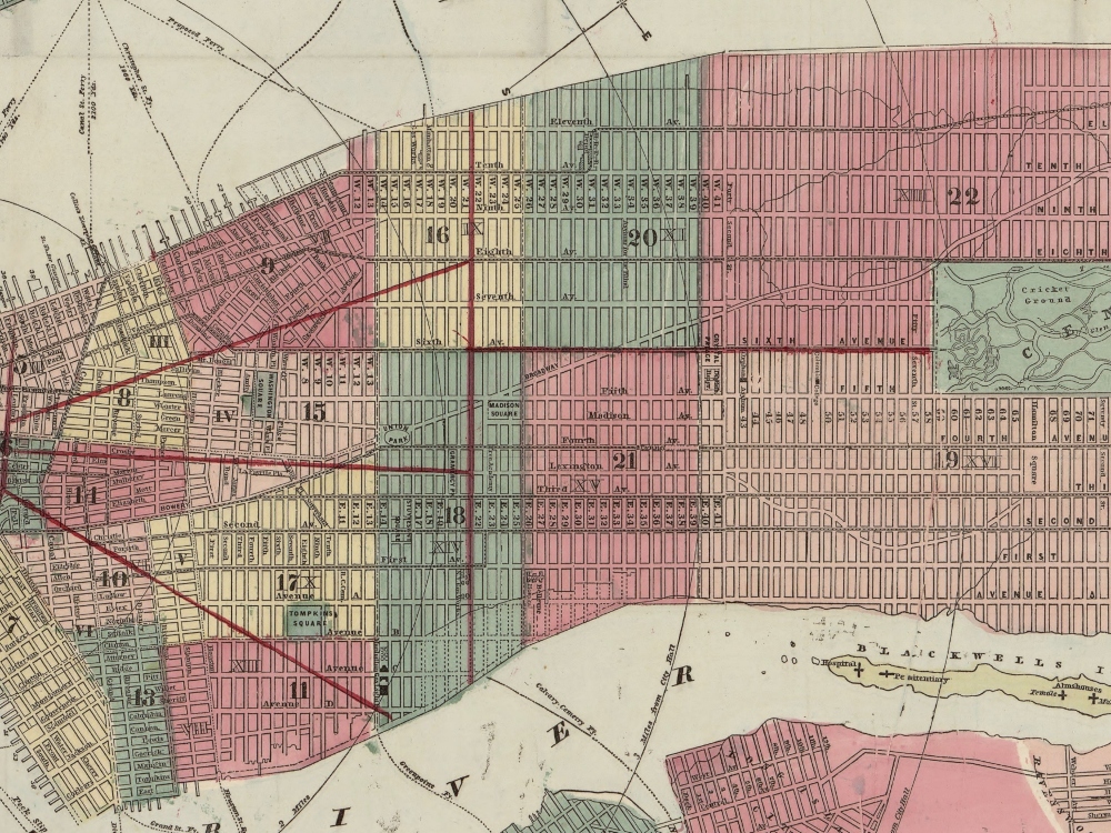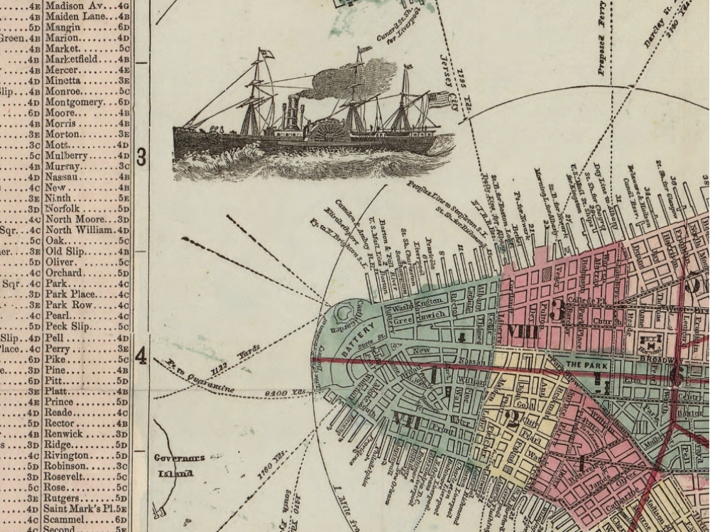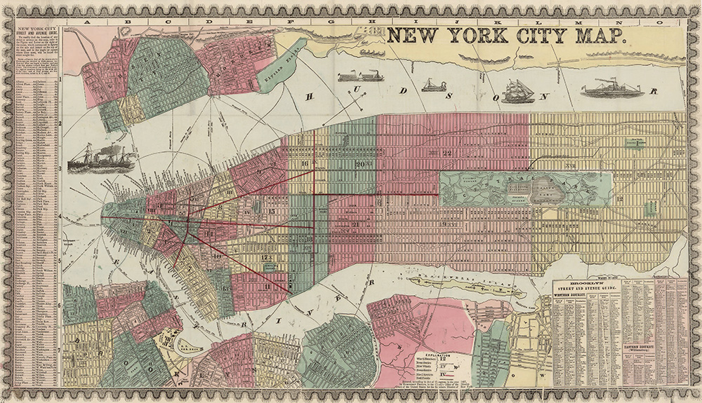 Miller’s New Map of the City of New York. The map covers New York City (Manhattan) south of 132nd Street. It also shows 1-mile radial distances from City Hall. Also covers part of Brooklyn (N.Y.), Jersey City (N.J.), and Hoboken (N.J.).