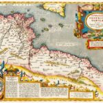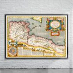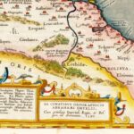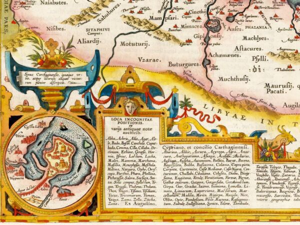 Abraham Ortelius’ map of ancient North Africa, from the 1595 Theatrum Orbis Terrarum. The map depicts the extent of the Roman Province of Africa, as well as parts of the neighbouring provinces of Mauretania Caesariensis, Numidia, Cyrenaica, and the southern half of Sicily. Principal cities are picked out in red. The inset shows the walled harbour of Carthage.
