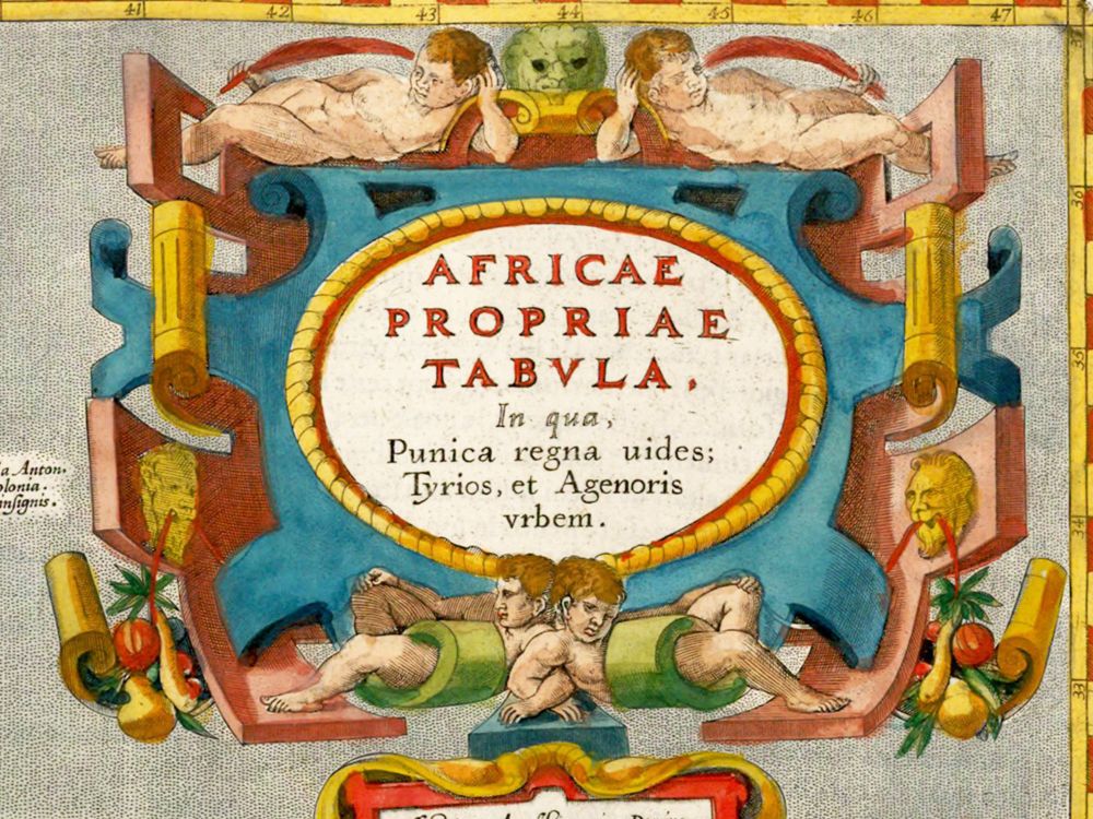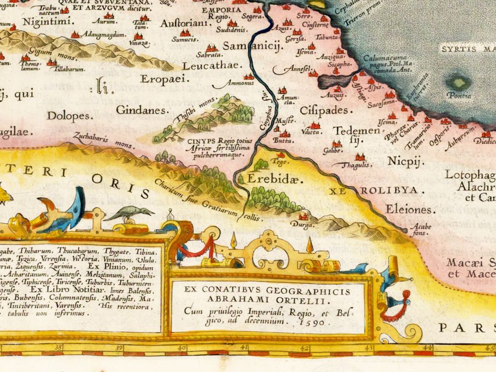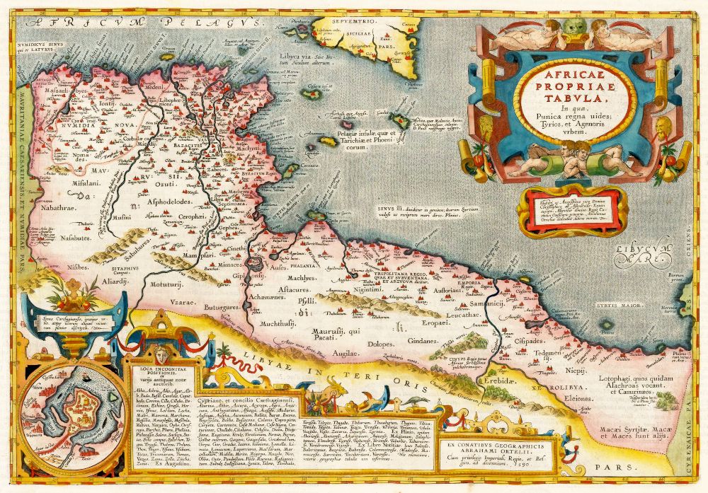 Abraham Ortelius’ map of ancient North Africa, from the 1595 Theatrum Orbis Terrarum. The map depicts the extent of the Roman Province of Africa, as well as parts of the neighbouring provinces of Mauretania Caesariensis, Numidia, Cyrenaica, and the southern half of Sicily. Principal cities are picked out in red. The inset shows the walled harbour of Carthage.