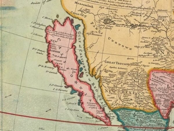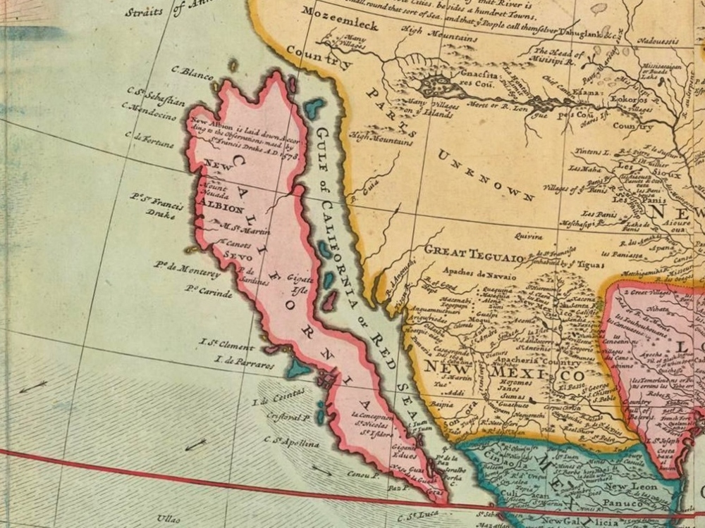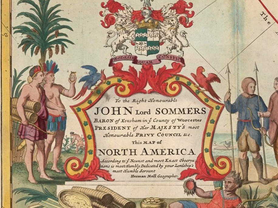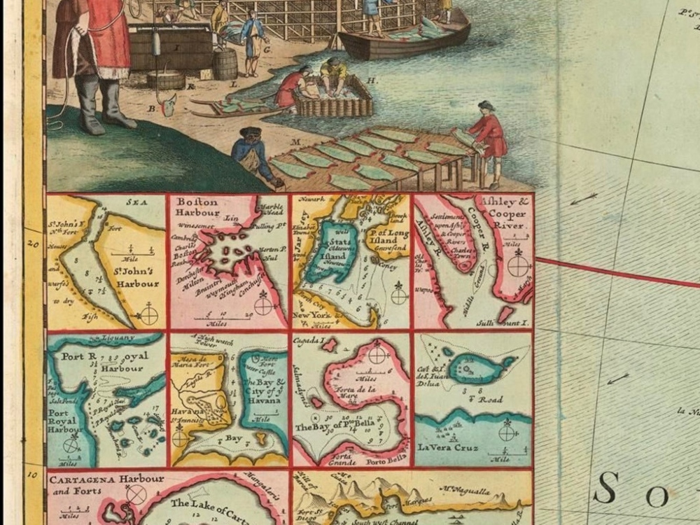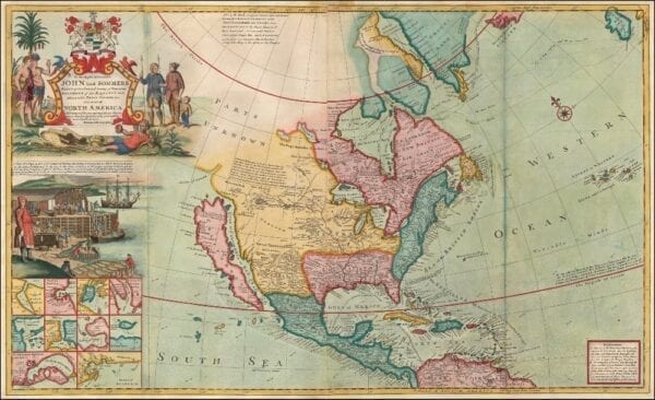 Herman Moll’s 1712 Map of North America showing indigenous people & products, the tracks of voyages into Hudsons Bay, a view of Newfoundland cod fishery and a text panel about the Spanish treasure fleet
