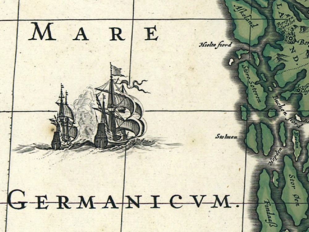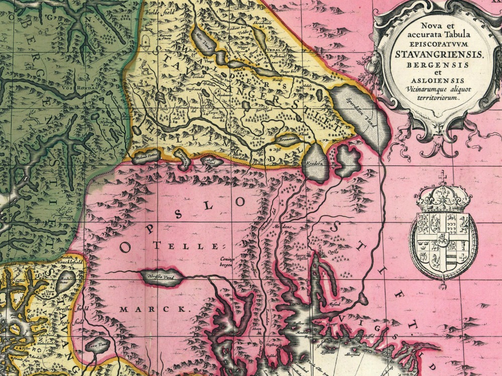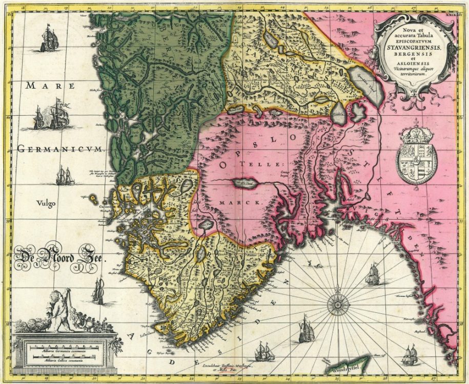 Jansson’s map of Norway from 1700, divided into its Provinces and showing in great detail the many waterways of the West Coast.