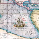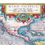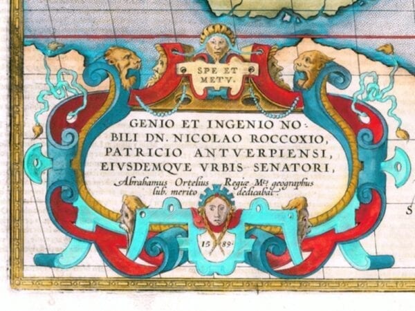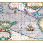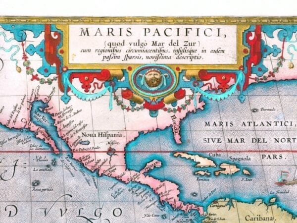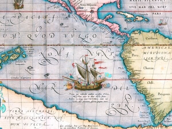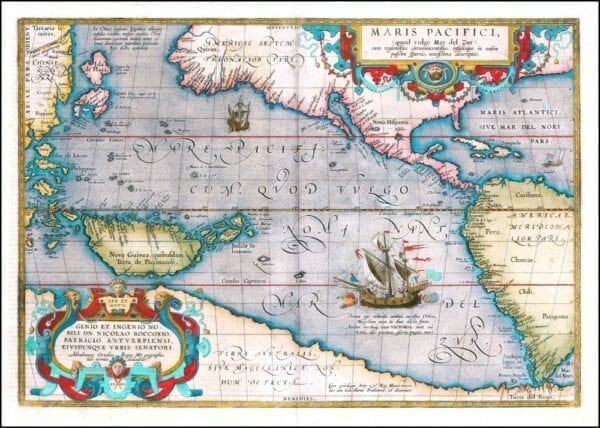 Abraham Ortelius’ Map of the Pacific Ocean from 1590. This seminal map of the Pacific is the first printed map devoted to the Pacific and the first to label the Americas separately as North and South. The map is adorned with two elaborate cartouches and Magellans surviving ship Victoria is pictured along with two smaller ships.