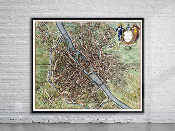 Highly decorative 17th century map of Paris by Jan Jansson. Notre Dame Cathedral is depicted in 3D on the Île de la Cité