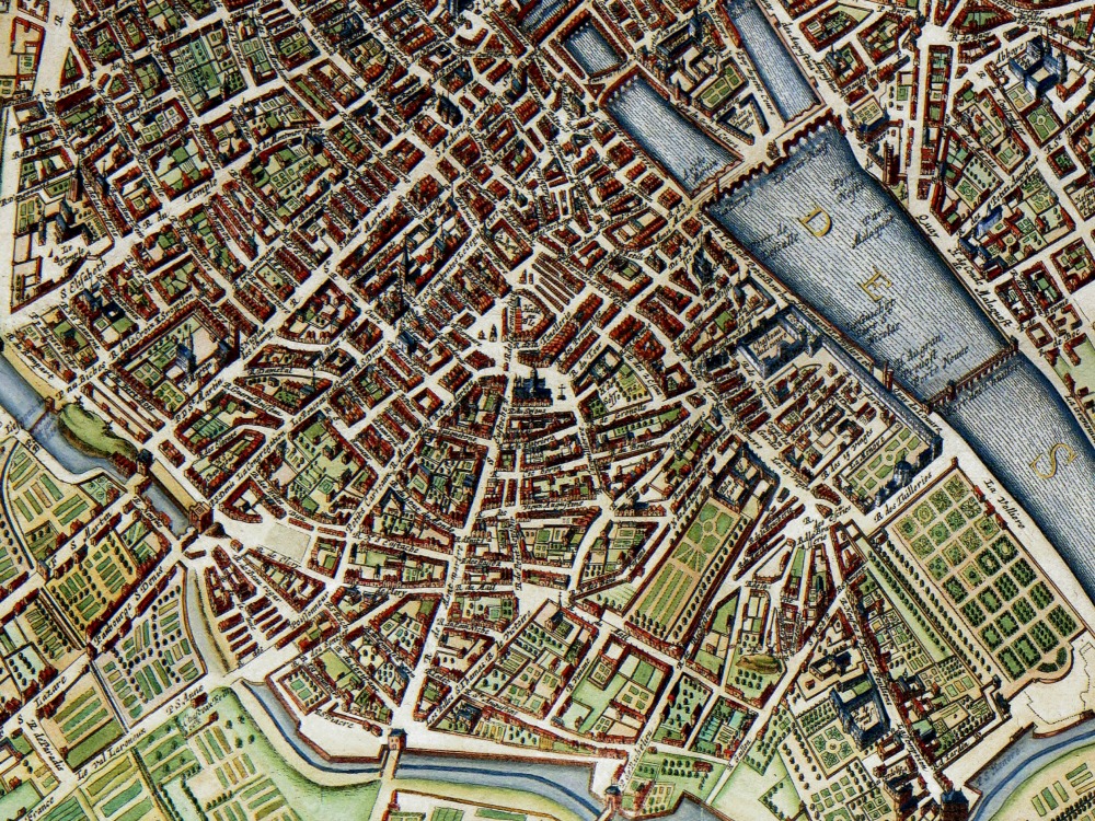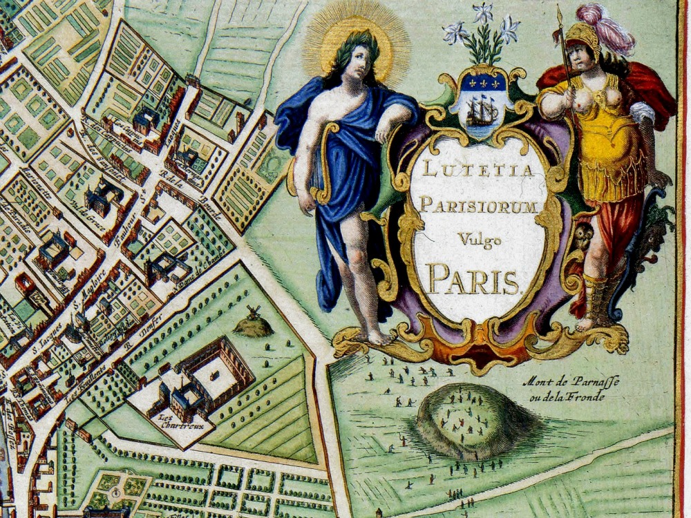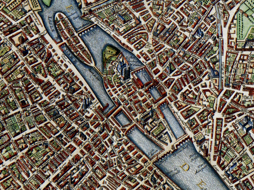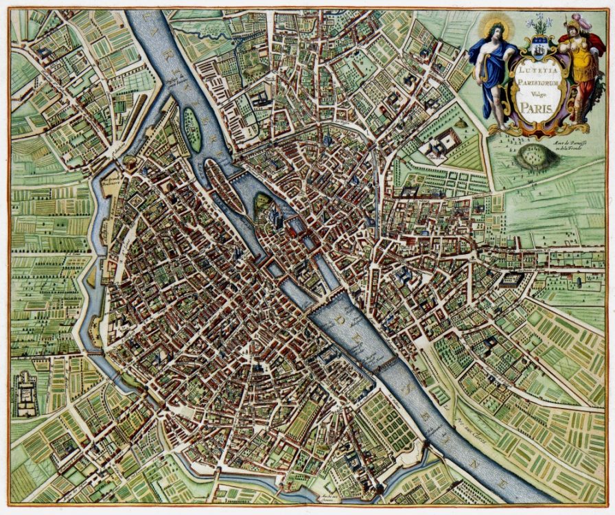 Highly decorative 17th century map of Paris by Jan Jansson. Notre Dame Cathedral is depicted in 3D on the Île de la Cité
