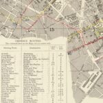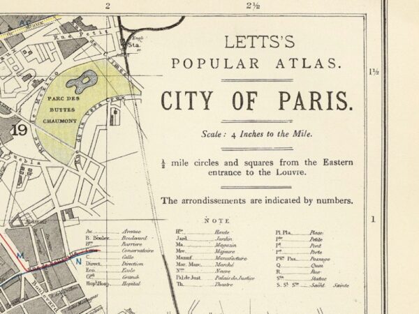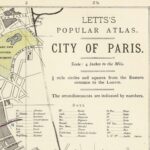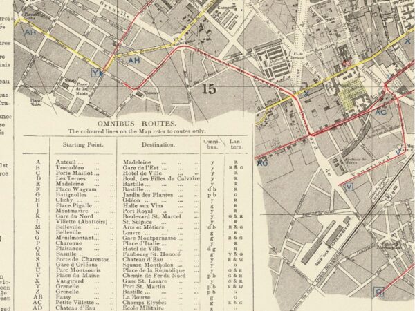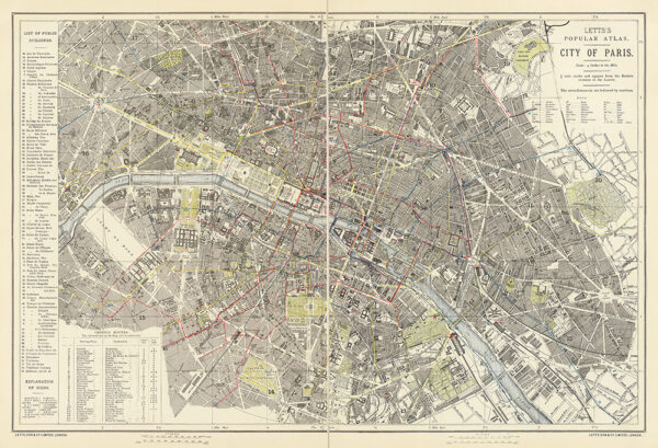 Letts’ 1883 Map of Paris, France, published in Letts’ Popular Atlas. The map depicsts streets, buildings, omnibus routes, railroads, parks, and includes keys to buildings and omnibus routes.