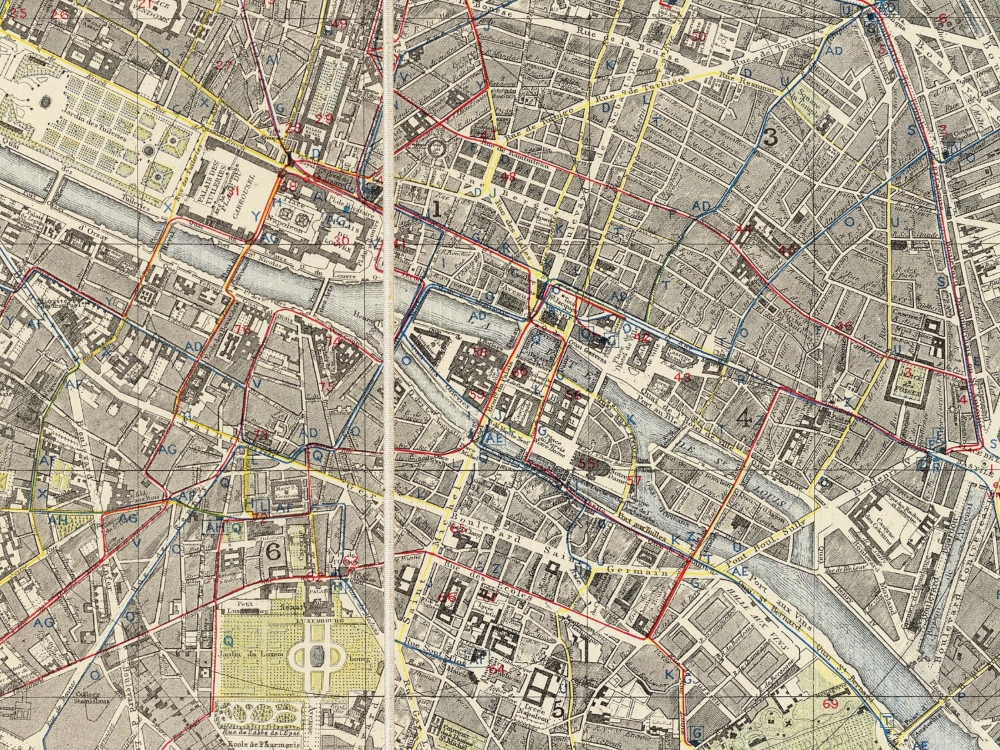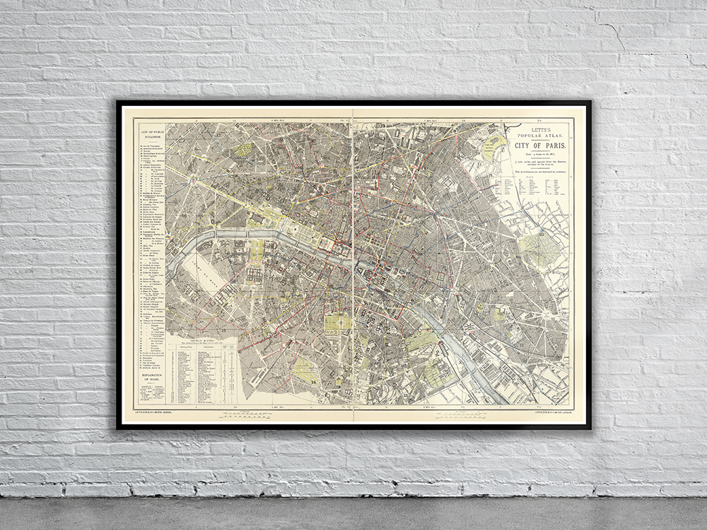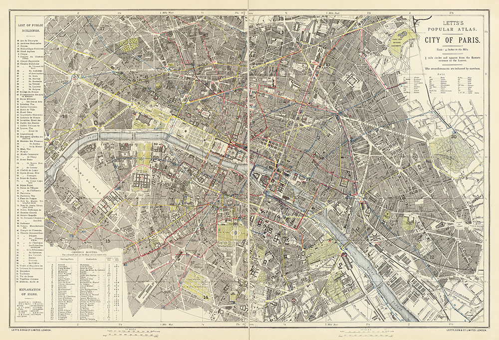Letts’ 1883 Map of Paris, France, published in Letts’ Popular Atlas. The map depicsts streets, buildings, omnibus routes, railroads, parks, and includes keys to buildings and omnibus routes.