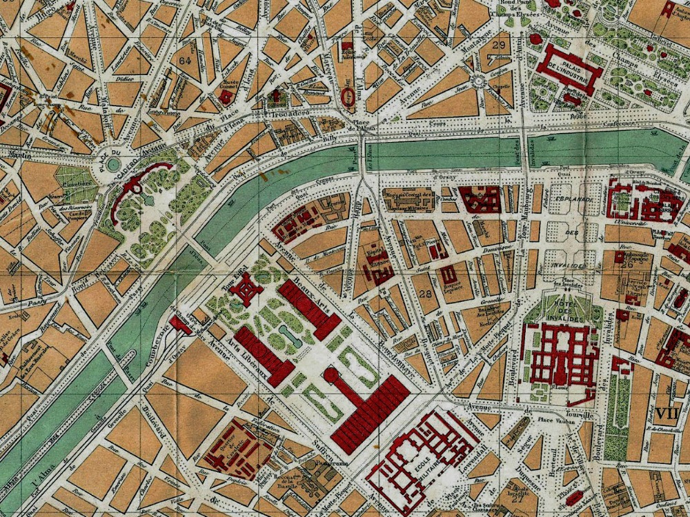 1892 map of Paris which covers the old walled city of Paris plus surrounding areas from the Bois de Boulogne to the Bois de Vincennes. Names countless important buildings, gardens and streets, including the Eiffel Tower, the Louvre, the Hotel des Invalides, the Jardin des Tuileries, and many other Parisian landmarks.