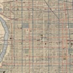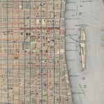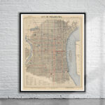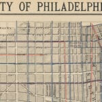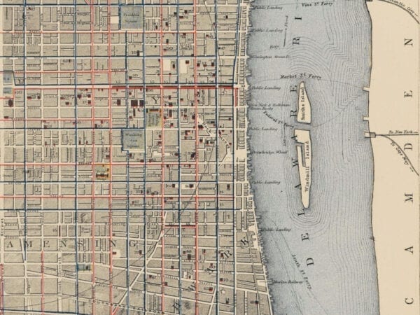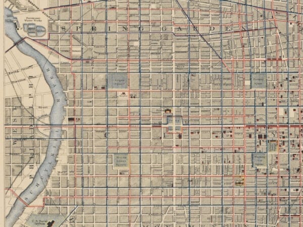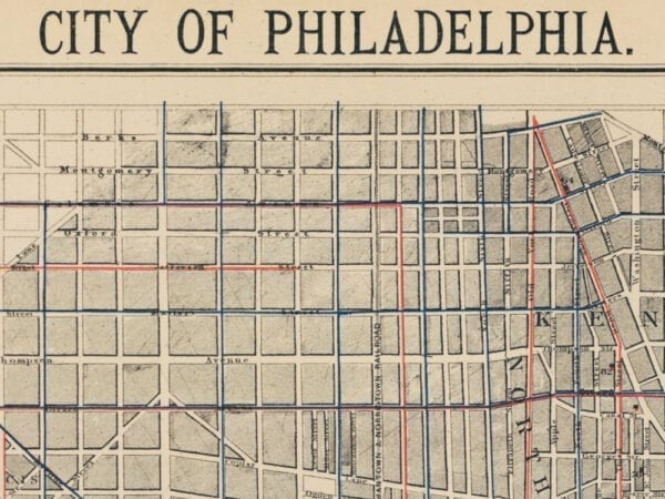 Vintage Map of Philadelphia from 1883 published by Letts & Sons. Showing major buildings, street car lines, wharves and the radial distances from Penn Square.